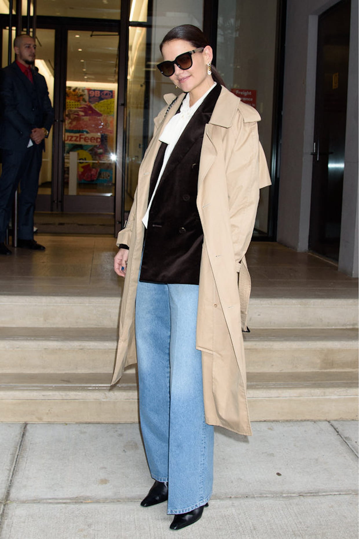 Katie Holmes en trench-coat et jean bleu ciel dans les rues de New York le 10 février 2020.