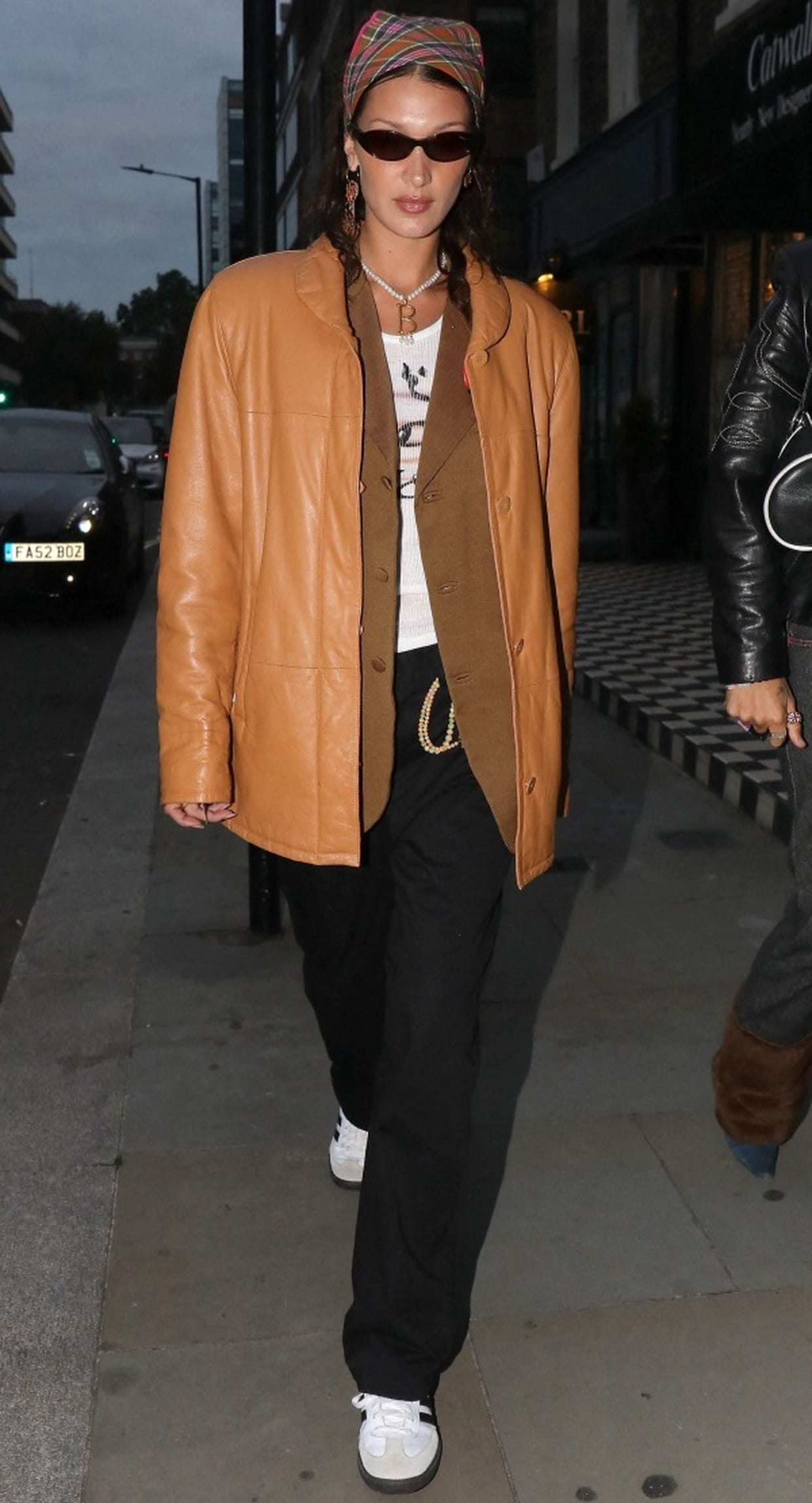 Bella Hadid en bandana et veste en cuir marron à Londres le 17 août 2021.
