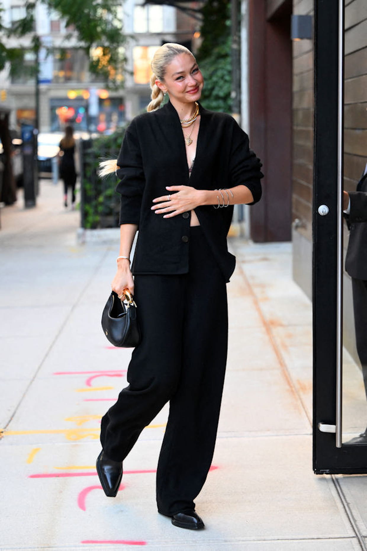 Gigi Hadid en chemise noire et pantalon assorti