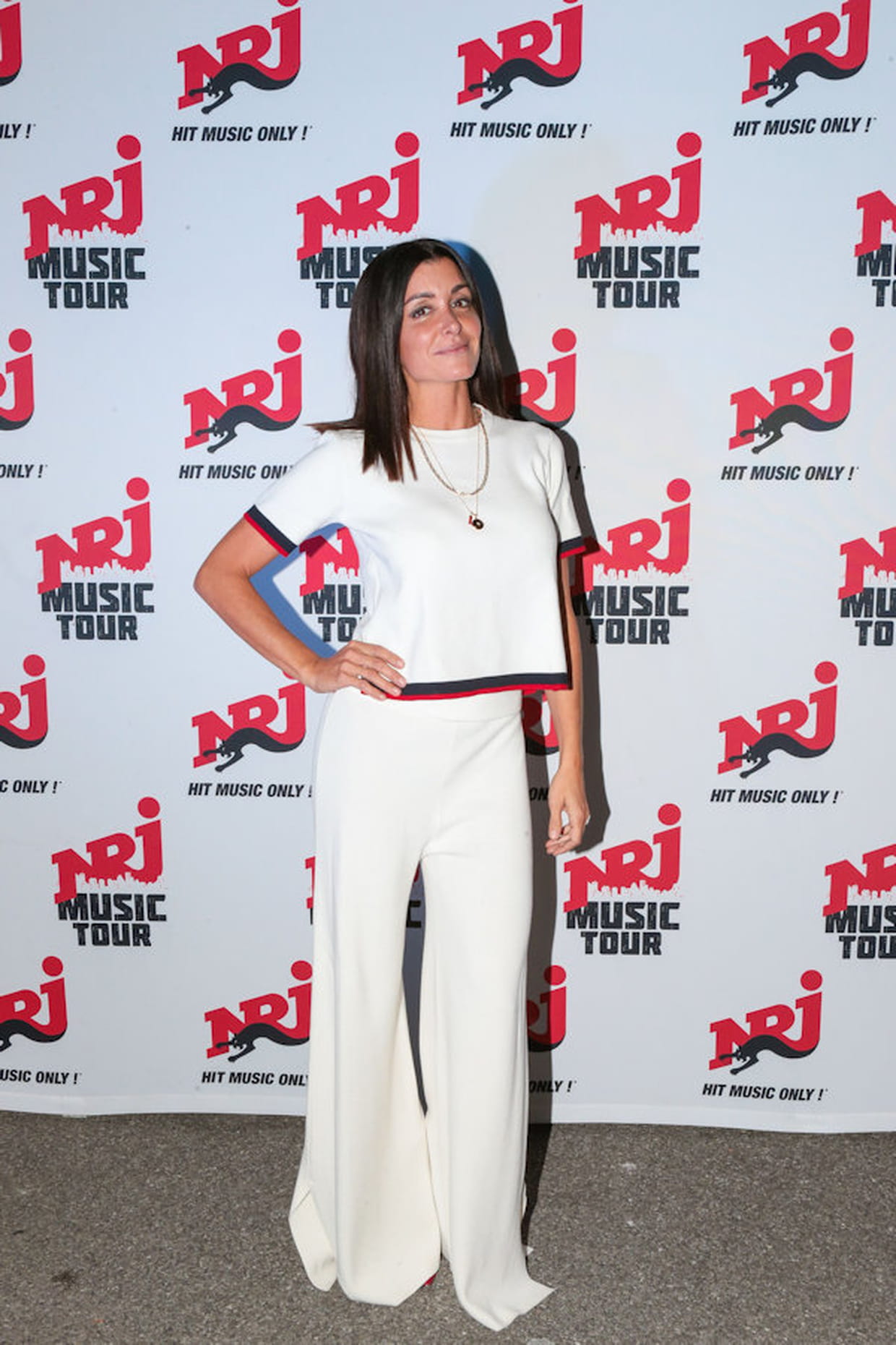Jenifer en T-shirt court et pantalon évasé blanc lors du NRJ Music Tour à Maubeuge le 15 septembre 2018.