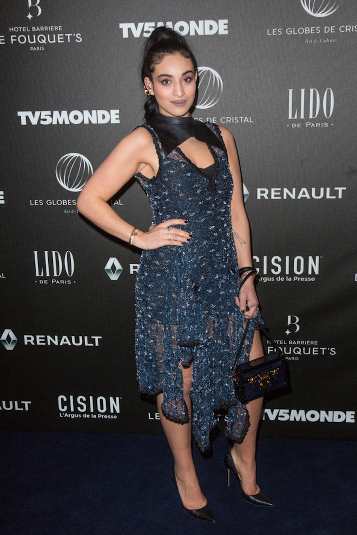 Camélia Jordana en robe fluide lors de la 12ème édition des Globes de Cristal à Paris le 12 février 2018.
