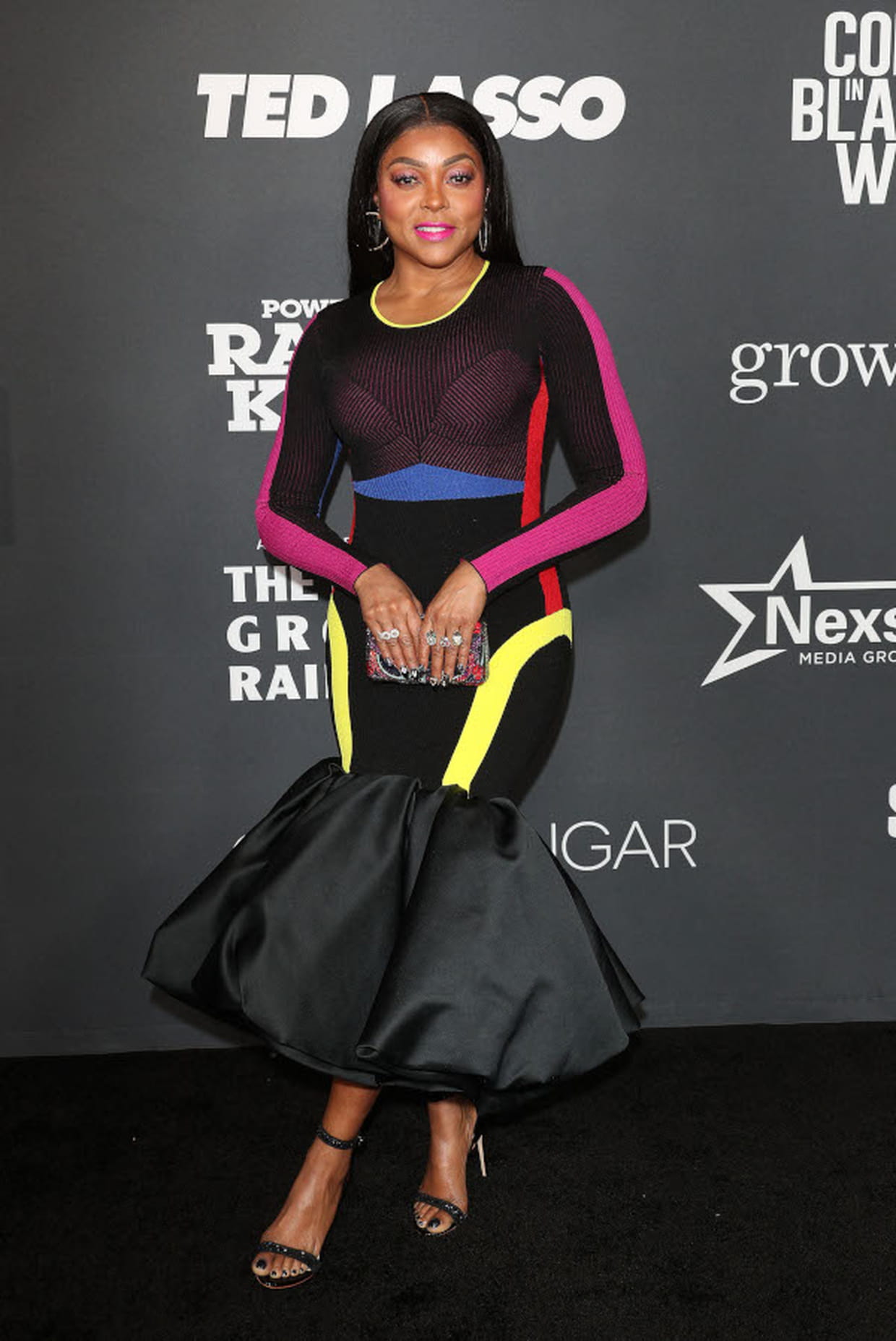 Taraji P. Henson (1970) en robe à bandes colorées lors d'un événement à Los Angeles le 6 décembre 2021.