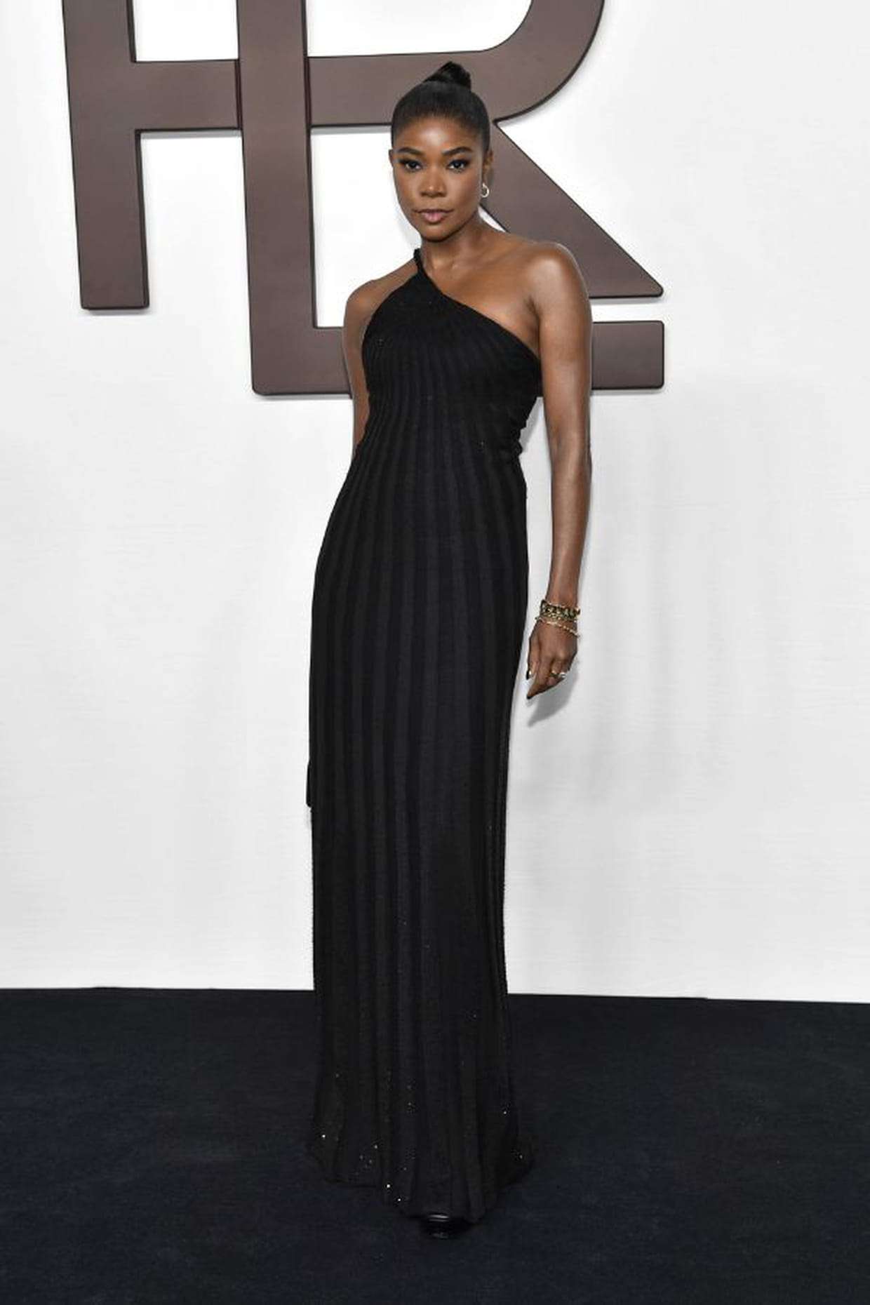 Gabrielle Union (1972) en robe près du corps asymétrique au défilé Ralph Lauren lors de la Fashion week printemps-été 2024 à New York le 8 septembre 2023.
