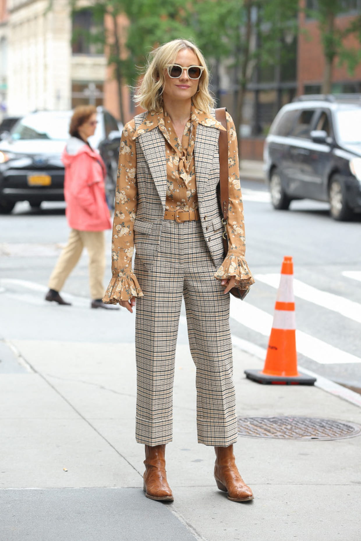 Diane Kruger en ensemble à carreaux et chemise jaune