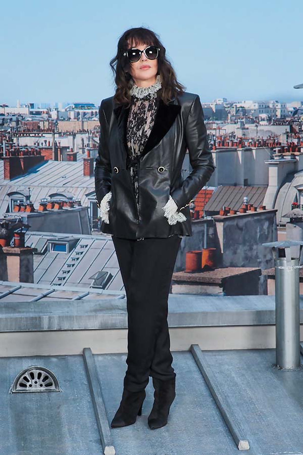 Isabelle Adjani en pantalon noir et veste en cuir au défilé Chanel pendant la Fashion week printemps-été 2020 à Paris le 1er octobre 2019.