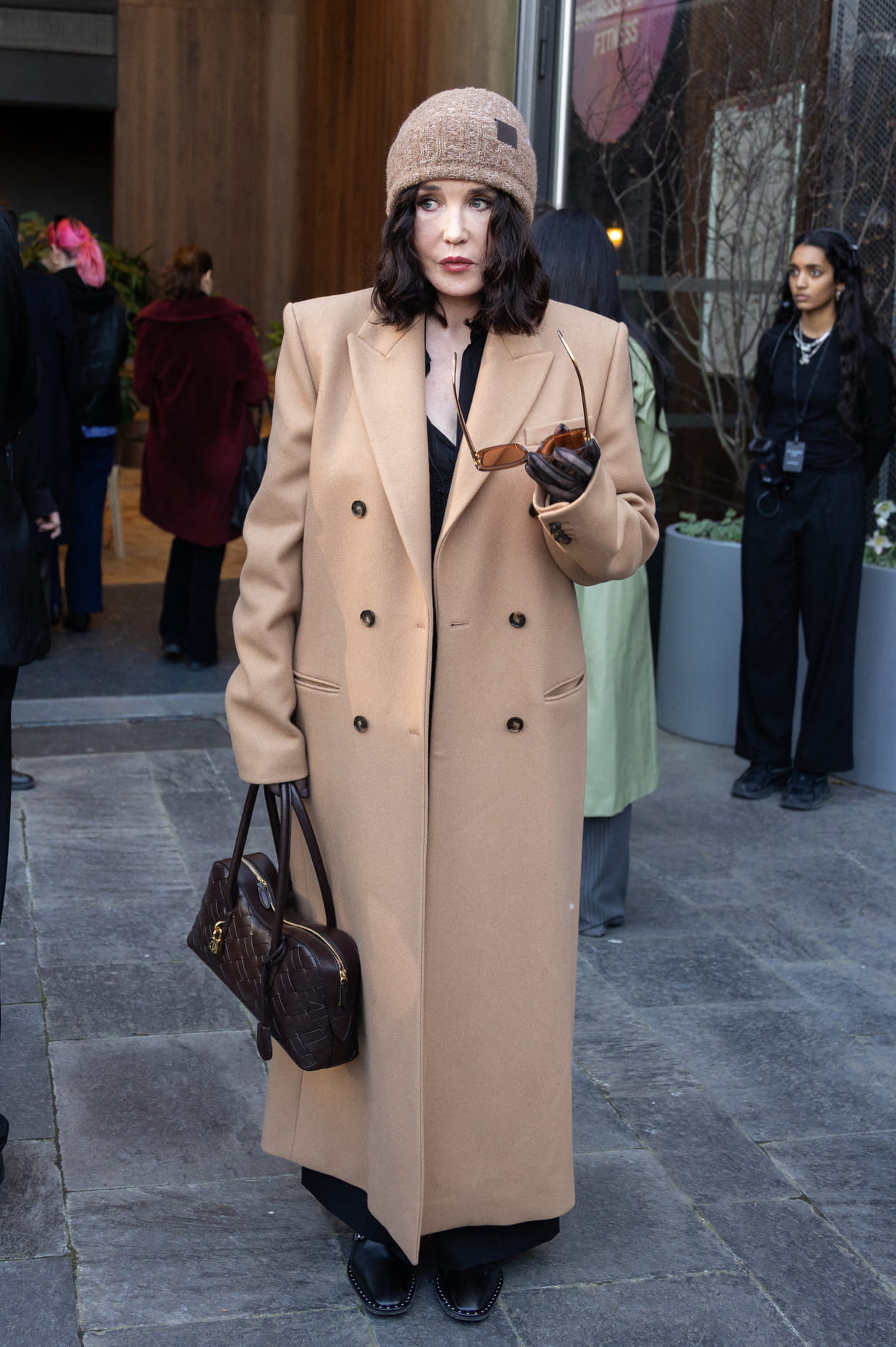 Isabelle Adjani en manteau long et bonnet marron au défilé Stella McCartney lors de la semaine de la mode à Paris le 05 mars 2025.