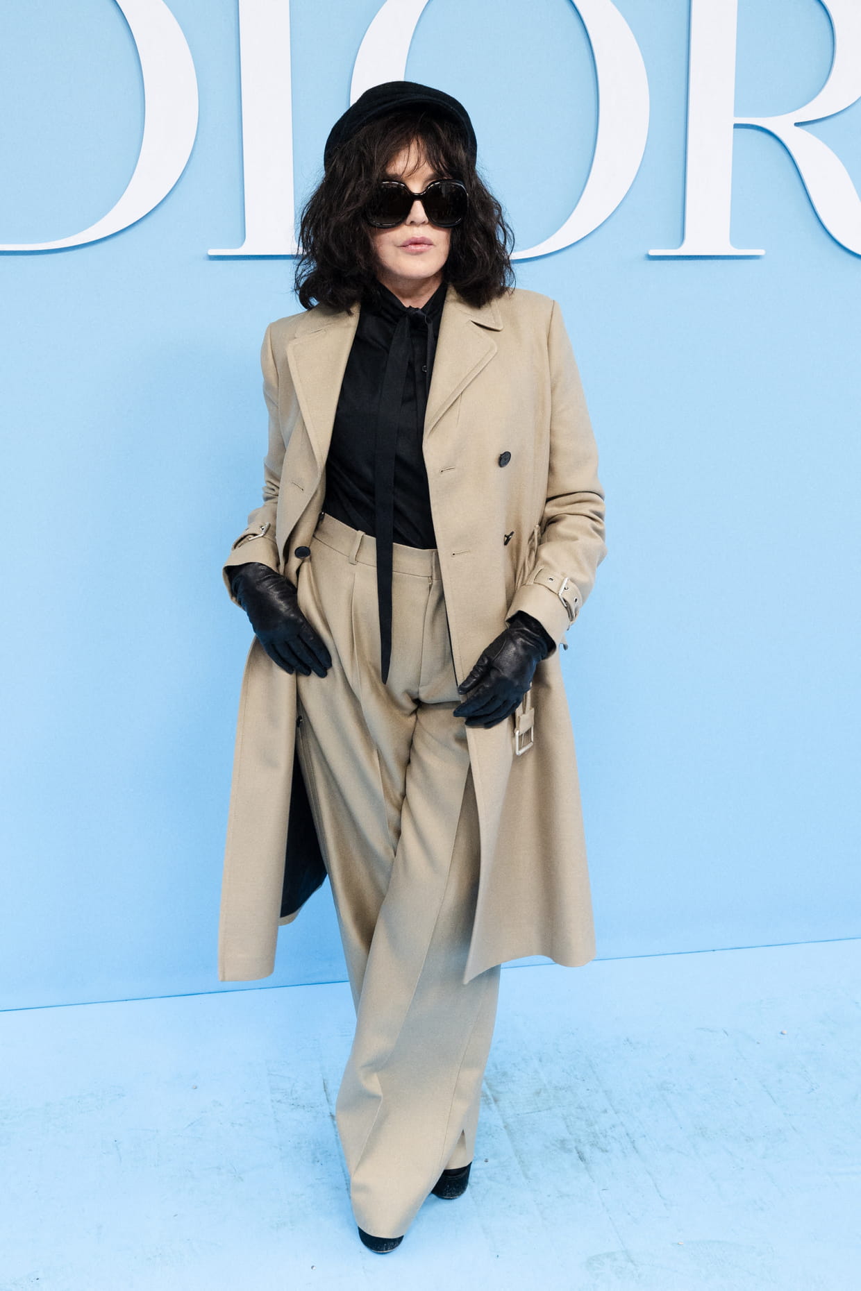Isabelle Adjani en pantalon et veste beige assortie, casquette gavroche et lunettes noires, au défilé Dior lors de la Fashion Week de Paris, le 24 septembre 2024.
