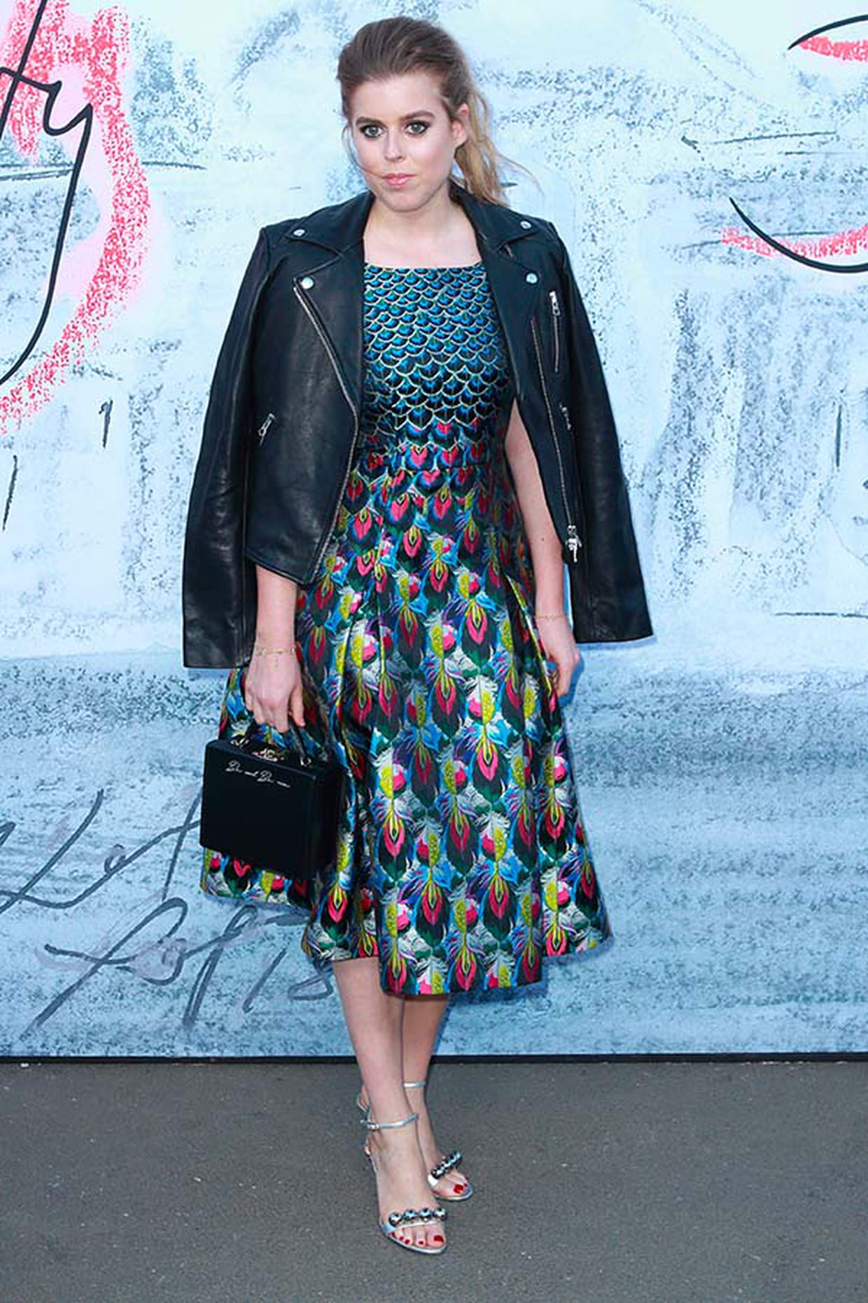 Beatrice d'York en robe à motifs et veste en cuir à la Serpentine Gallery Summer Party à Londres le 18 juin 2018.