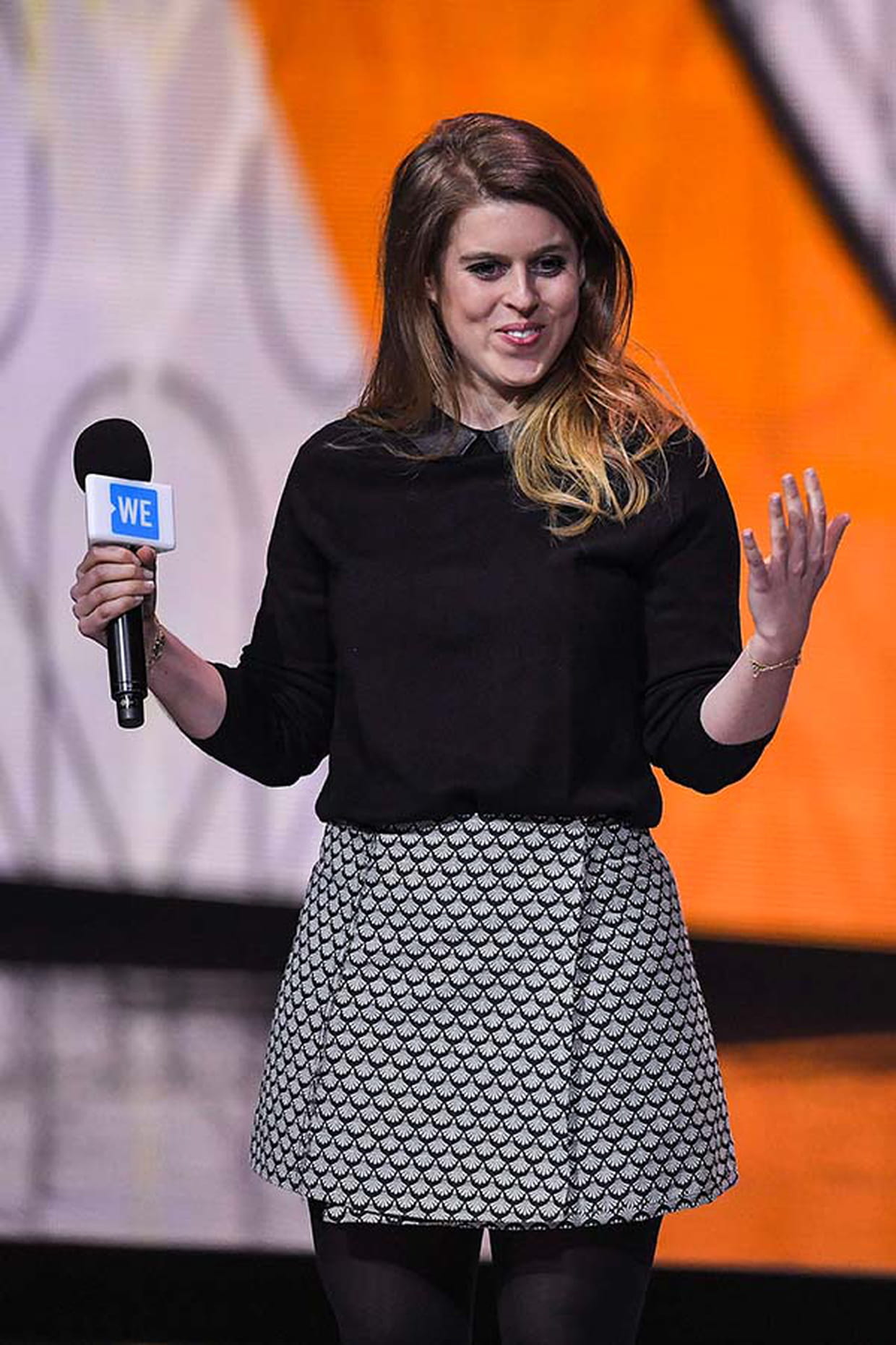 Beatrice d'York en jupe à motifs courte au York WE Day à Londres le 7 mars 2018.