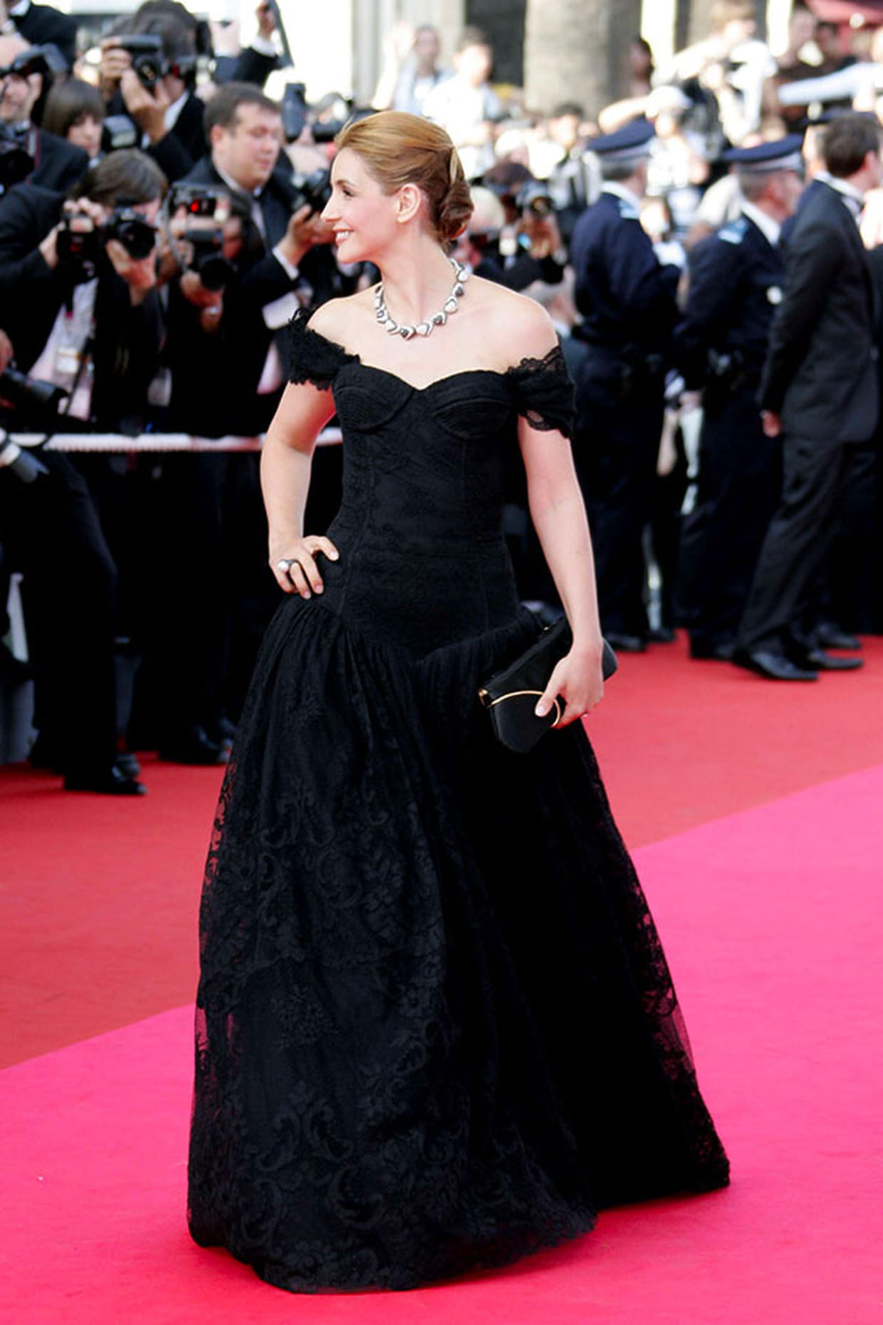 Clotilde Courau en robe longue noire en dentelle et encolure Bardot