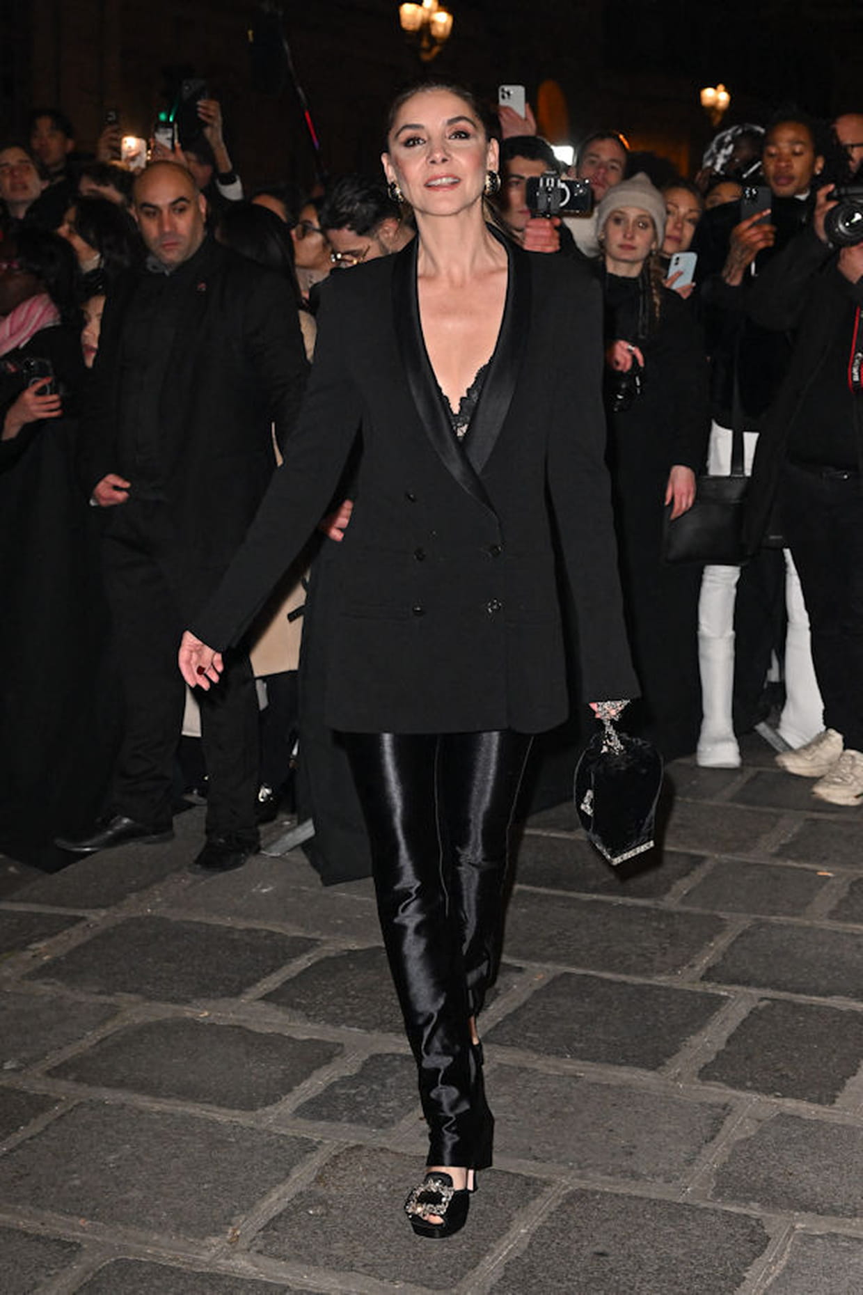 Clotilde Courau en soutien-gorge en dentelle et pantalon satiné au défilé Jean Gaultier pendant la fashion week haute couture à Paris le 25 janvier 2023.
