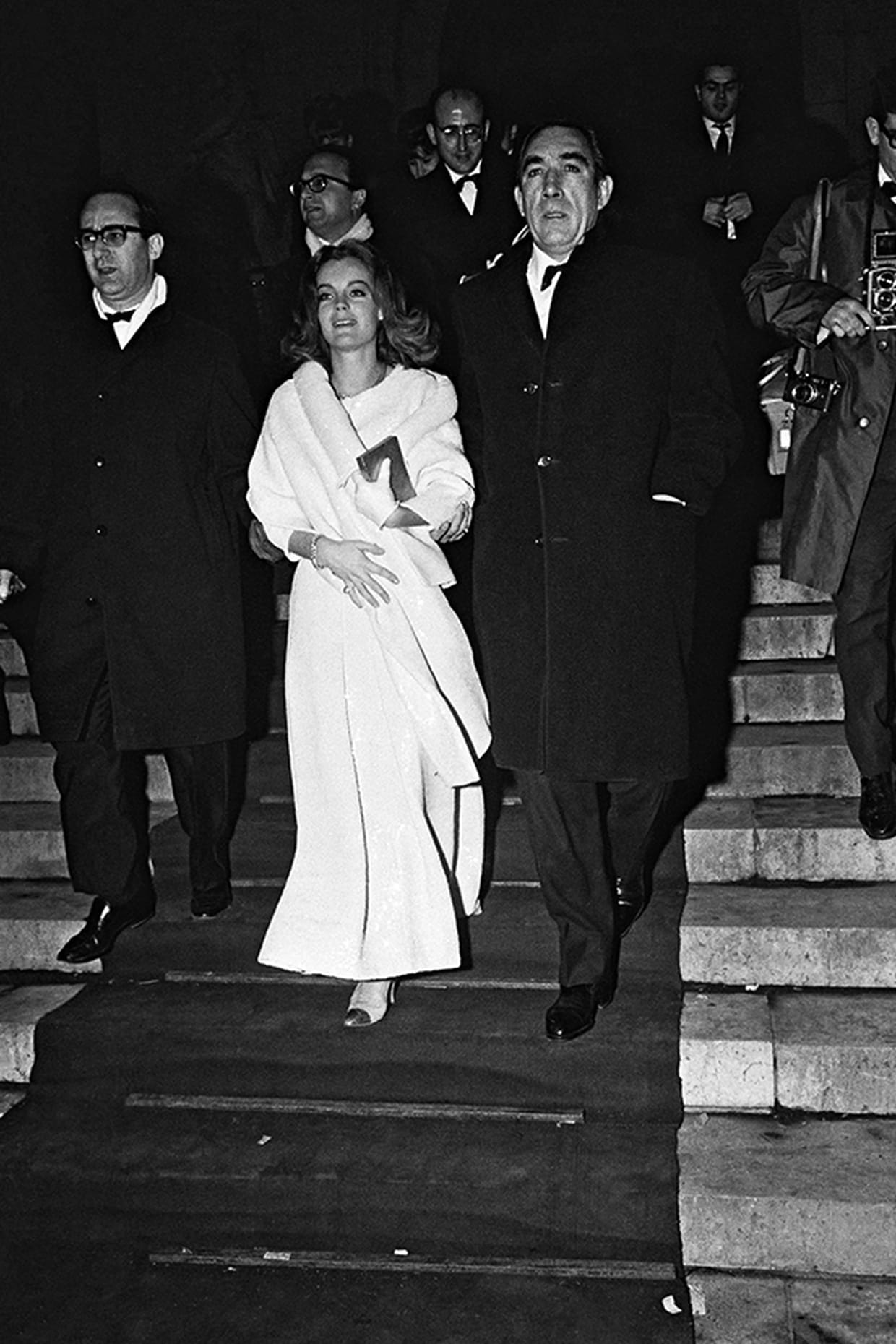Romy Schneider en manteau blanc lors de la première du film Le cardinal à l'Opéra Garnier de Paris le 20 décembre 1963.