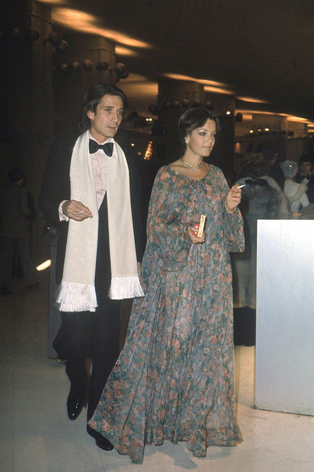 Romy Schneider en robe fleurie avec Daniel Biasini dans un théâtre à Paris en 1979.