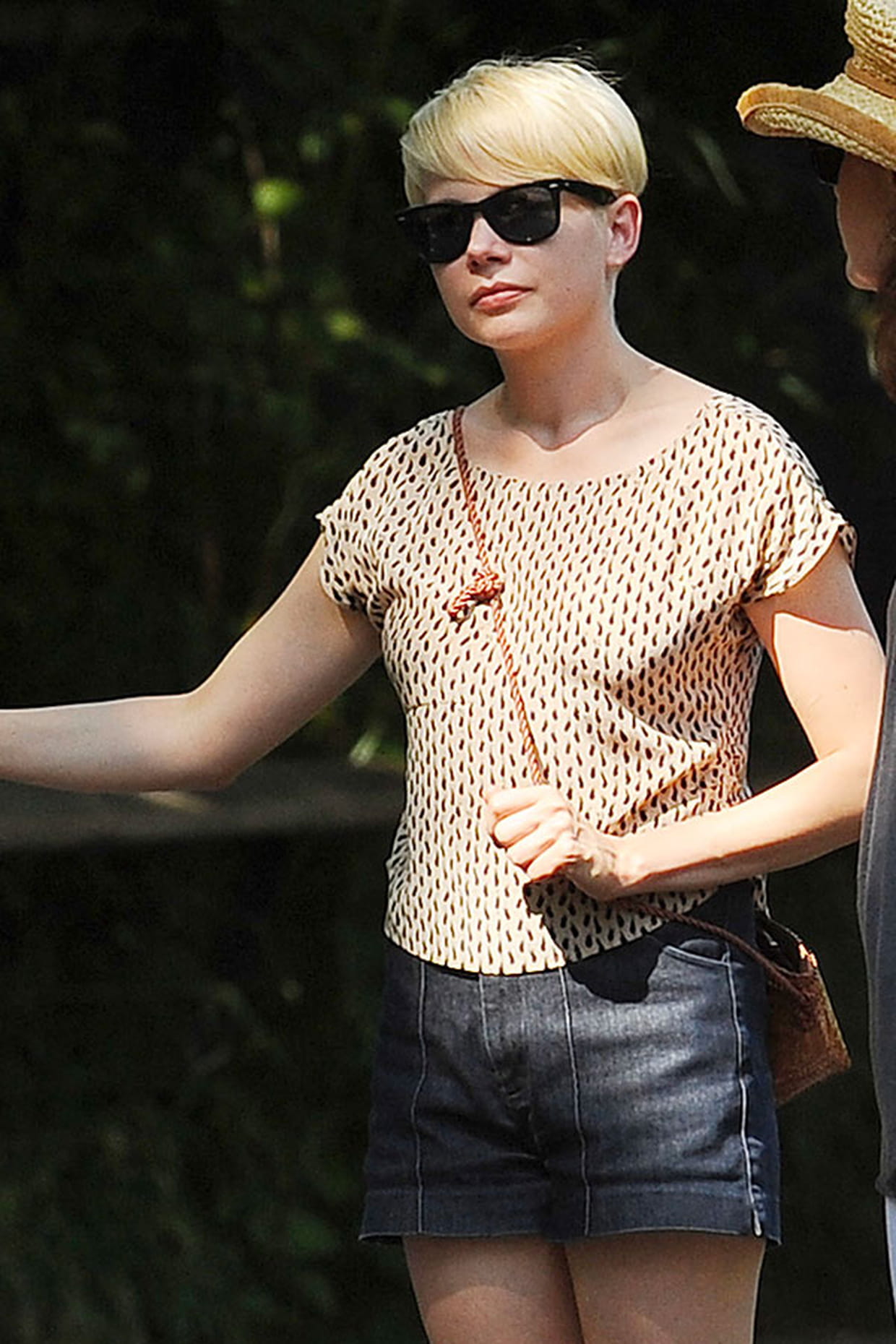 Michelle Williams en short en jean et blouse à motifs en balade à New York le 31 août 2012.