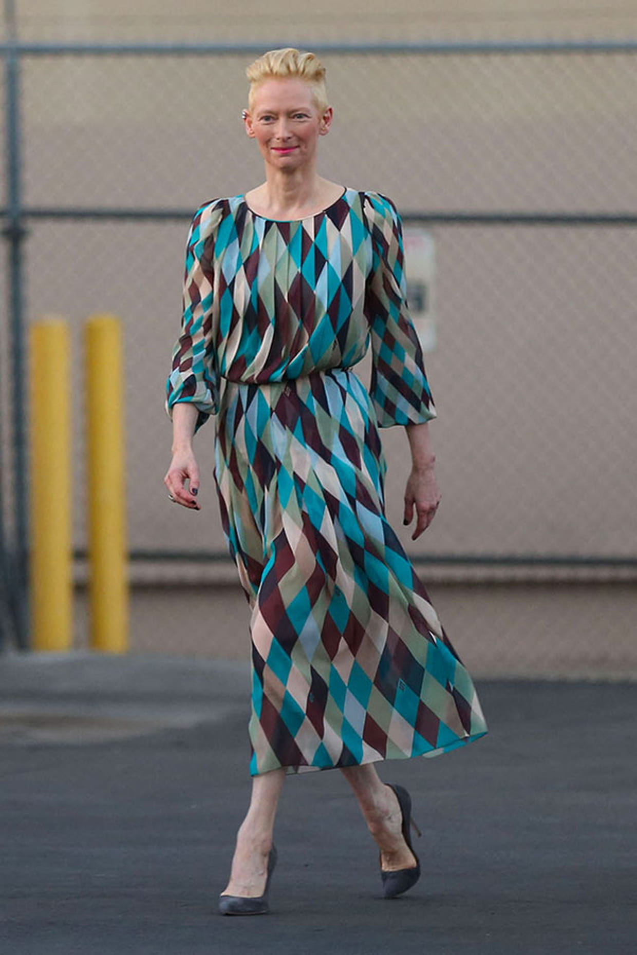 Tilda Swinton en robe à motifs après une apparition sur le plateau de l'émission "The Jimmy Kimmel Live Show" à Los Angeles le 18 octobre 2016.