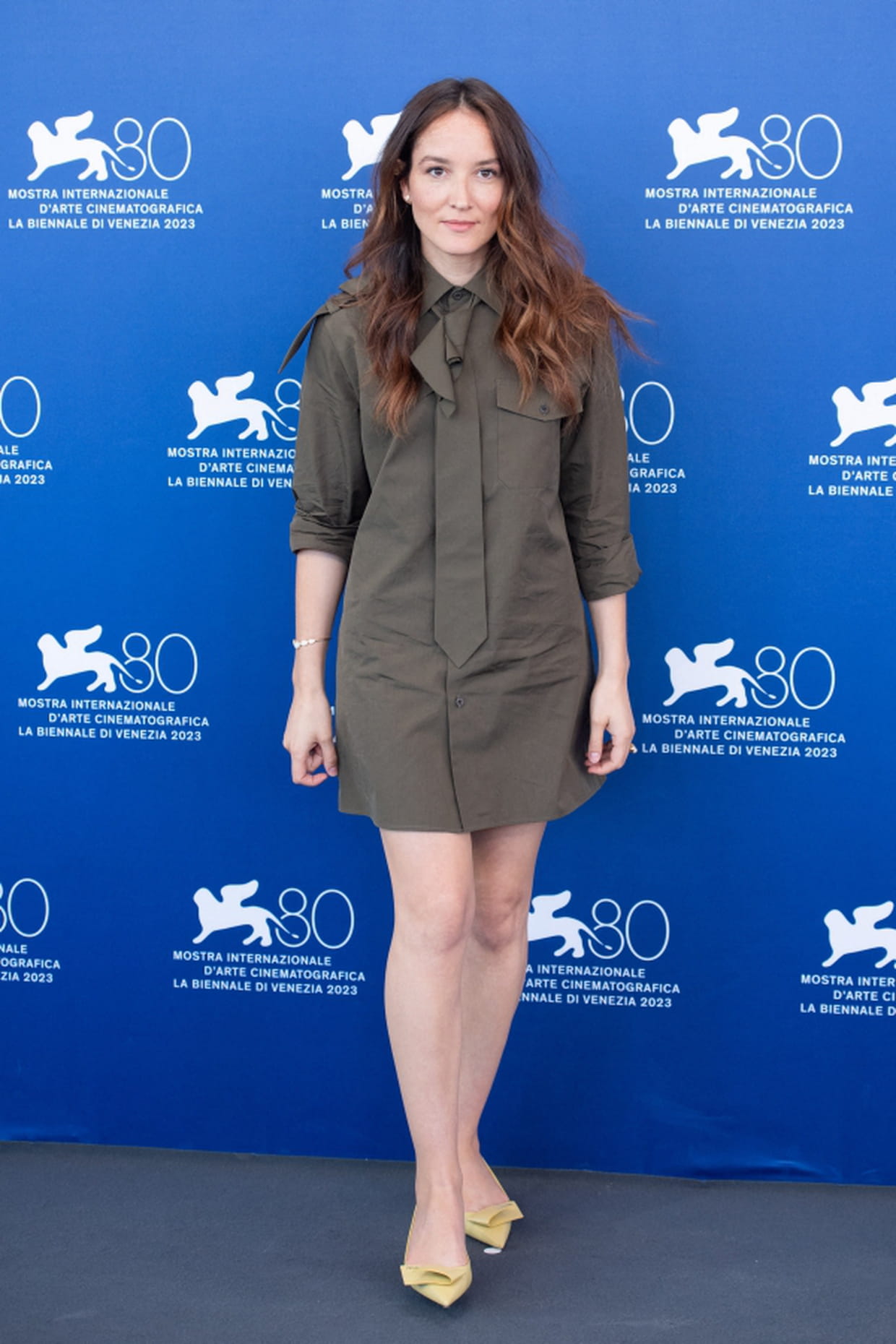 Anaïs Demoustier en robe taupe courte avec cravate lors du 80ème festival de film de Venise la Mostra le 7 septembre 2023.