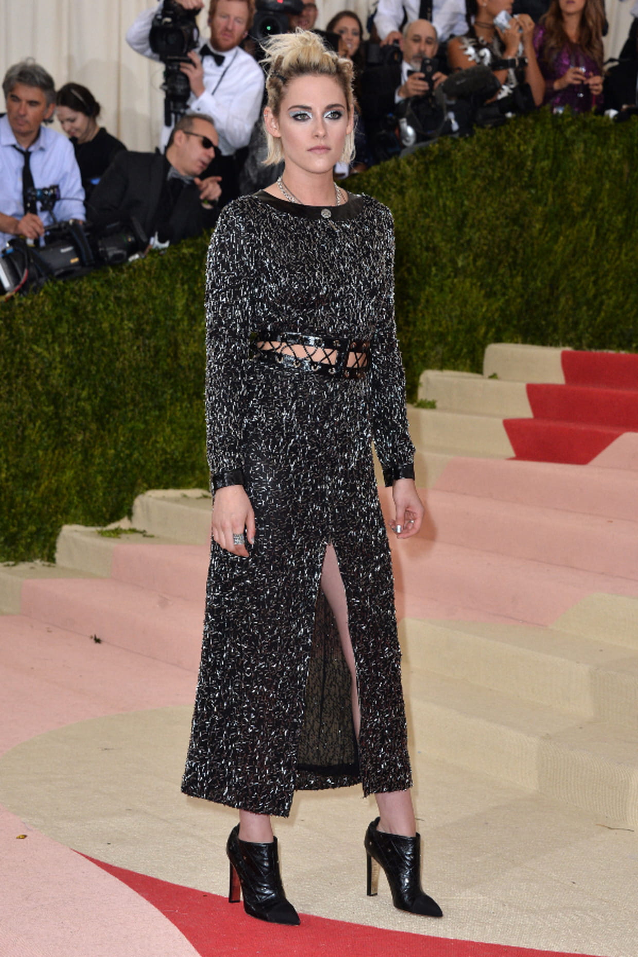 Kristen Stewart en robe fendue brillante Chanel au Met Gala à New York le 2 mai 2016.