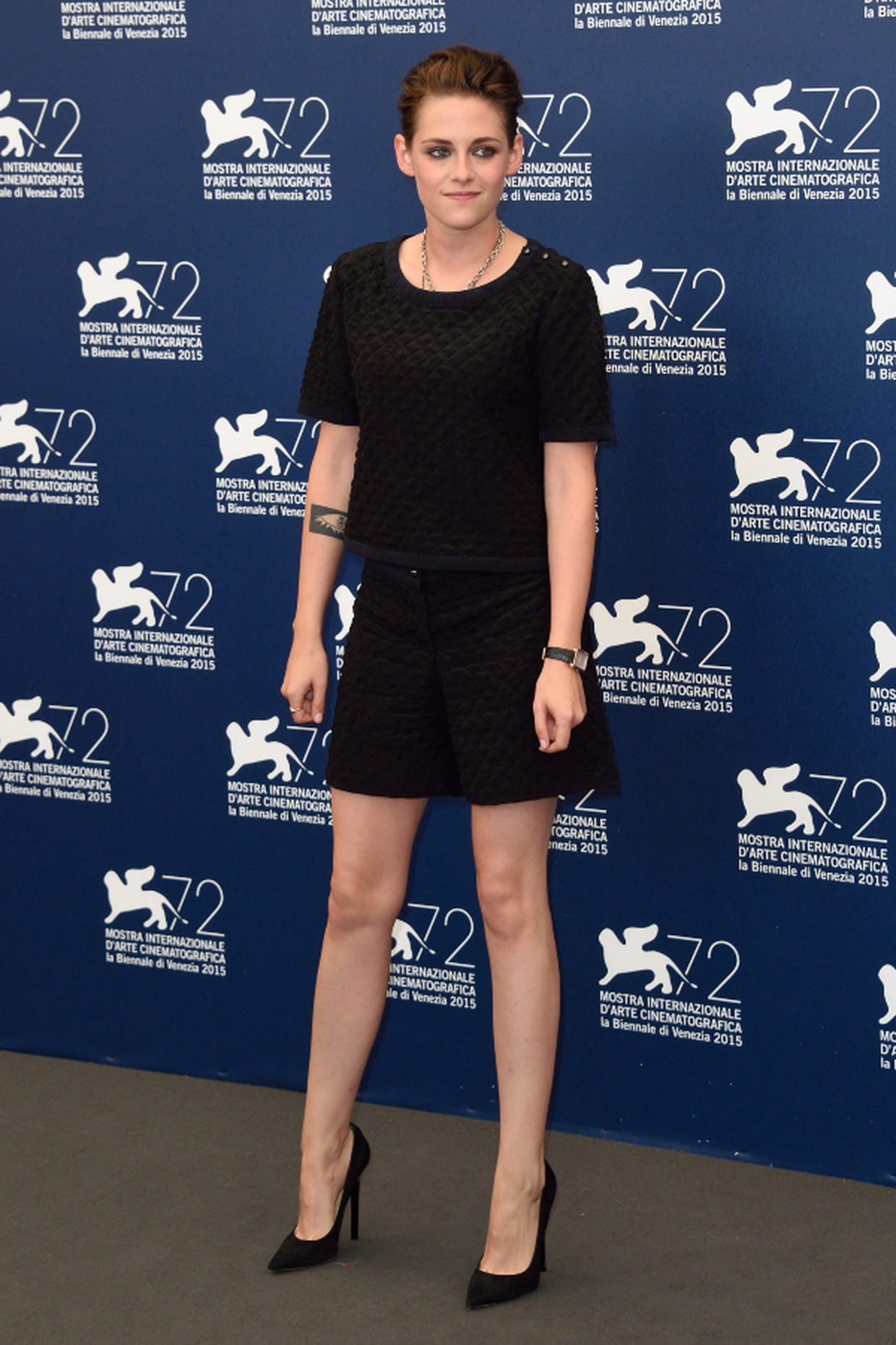 Kristen Stewart en ensemble noir matelassé Chanel à la 72ème édition de la Mostra de Venise le 5 septembre 2015.