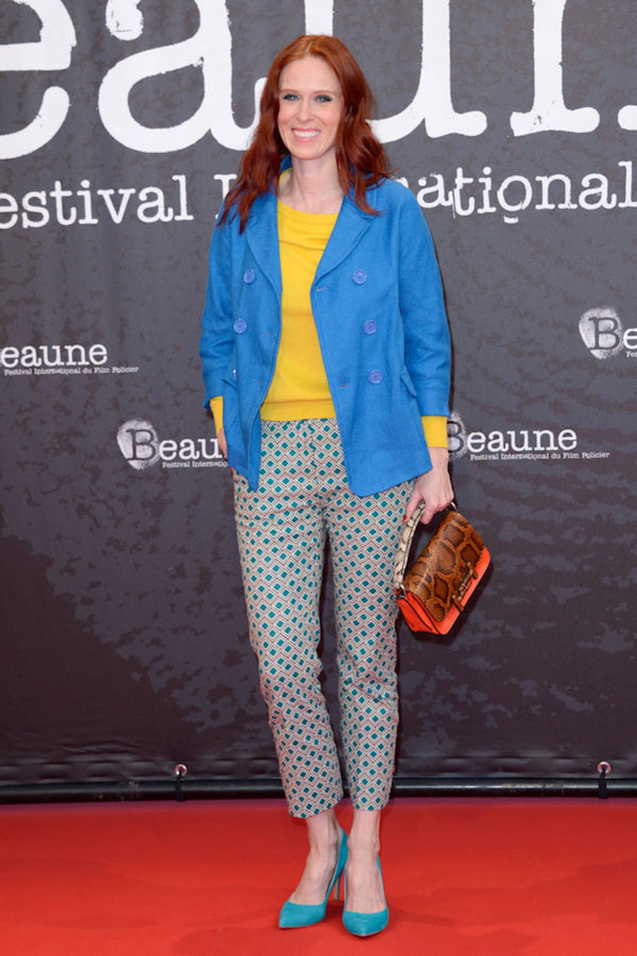 Audrey Fleurot en veste bleue et haut jaune au 9ème festival international du film policier de Beaunes le 30 mars 2017.