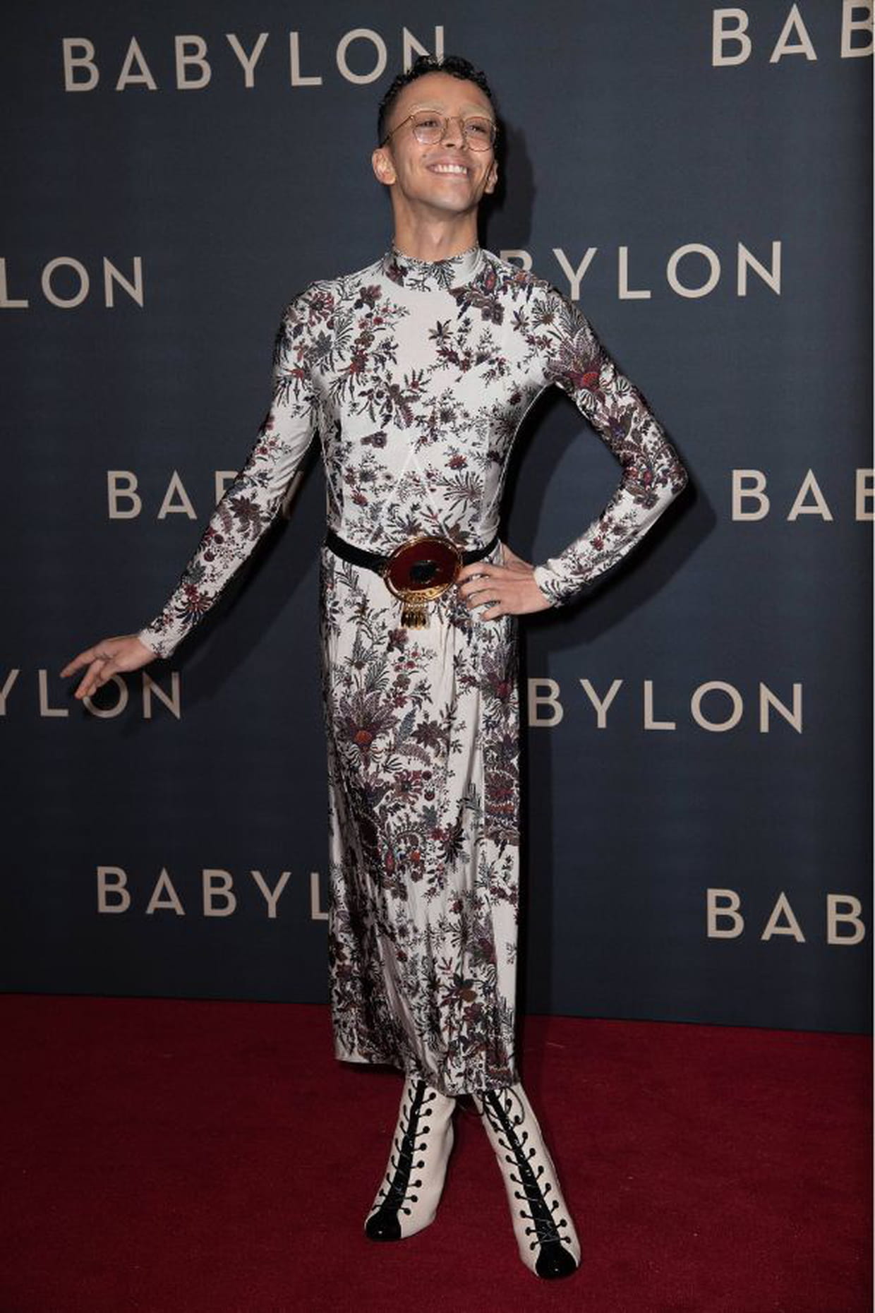 Bilal Hassani en robe imprimée à l'avant-première du film Babylon à Paris le 14 janvier 2023.