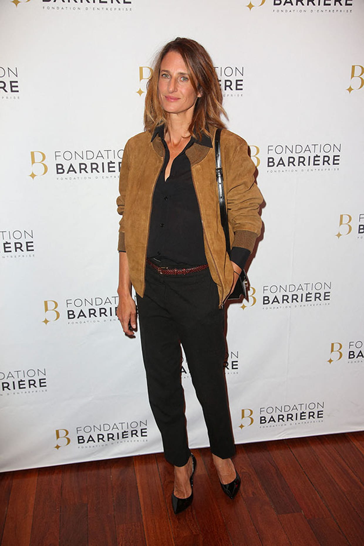 Camille Cottin en pantalon noir et veste en daim