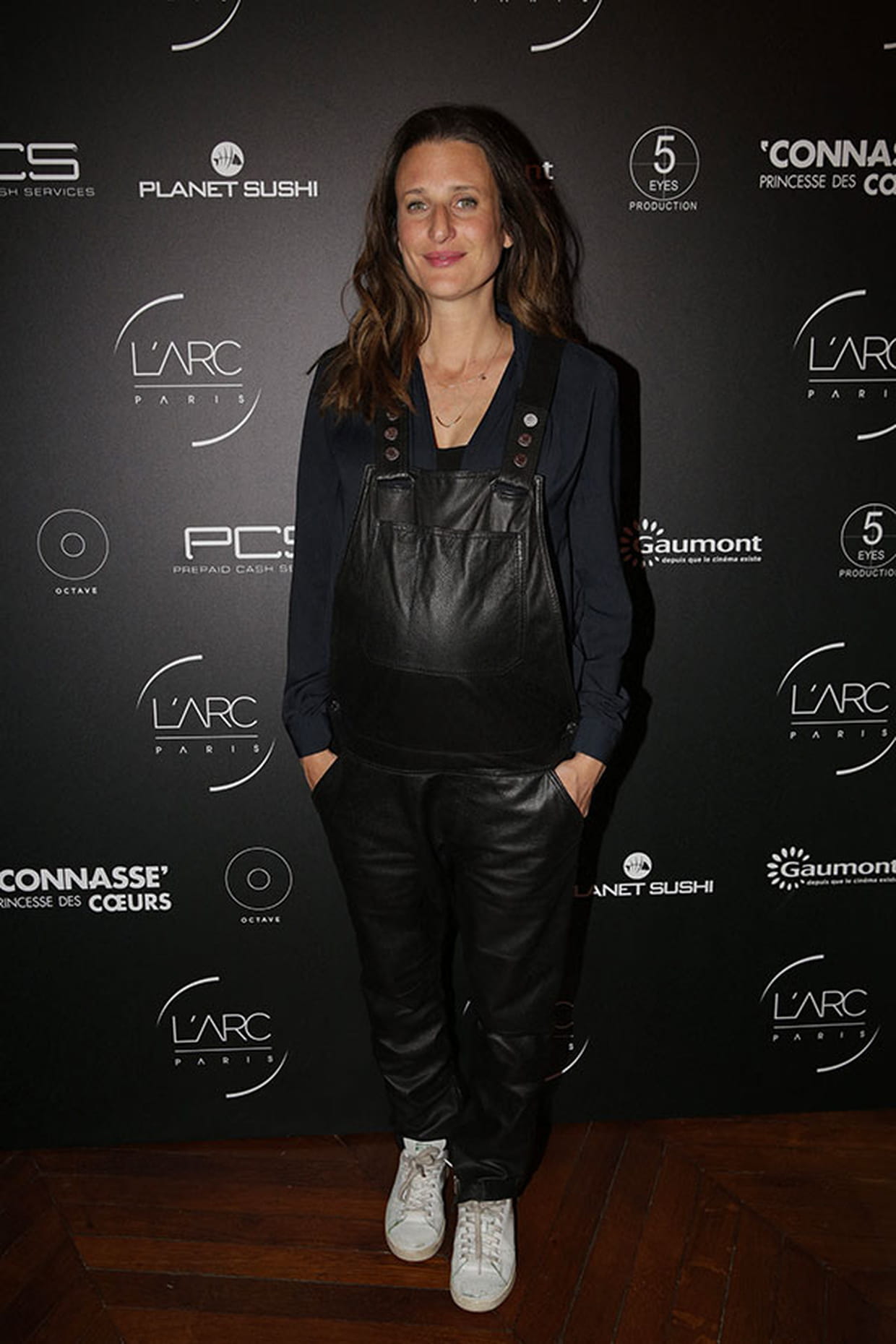 Camille Cottin en salopette noire façon cuir à la soirée du film Connasse, princesse des cœurs à Paris le 23 avril 2015.