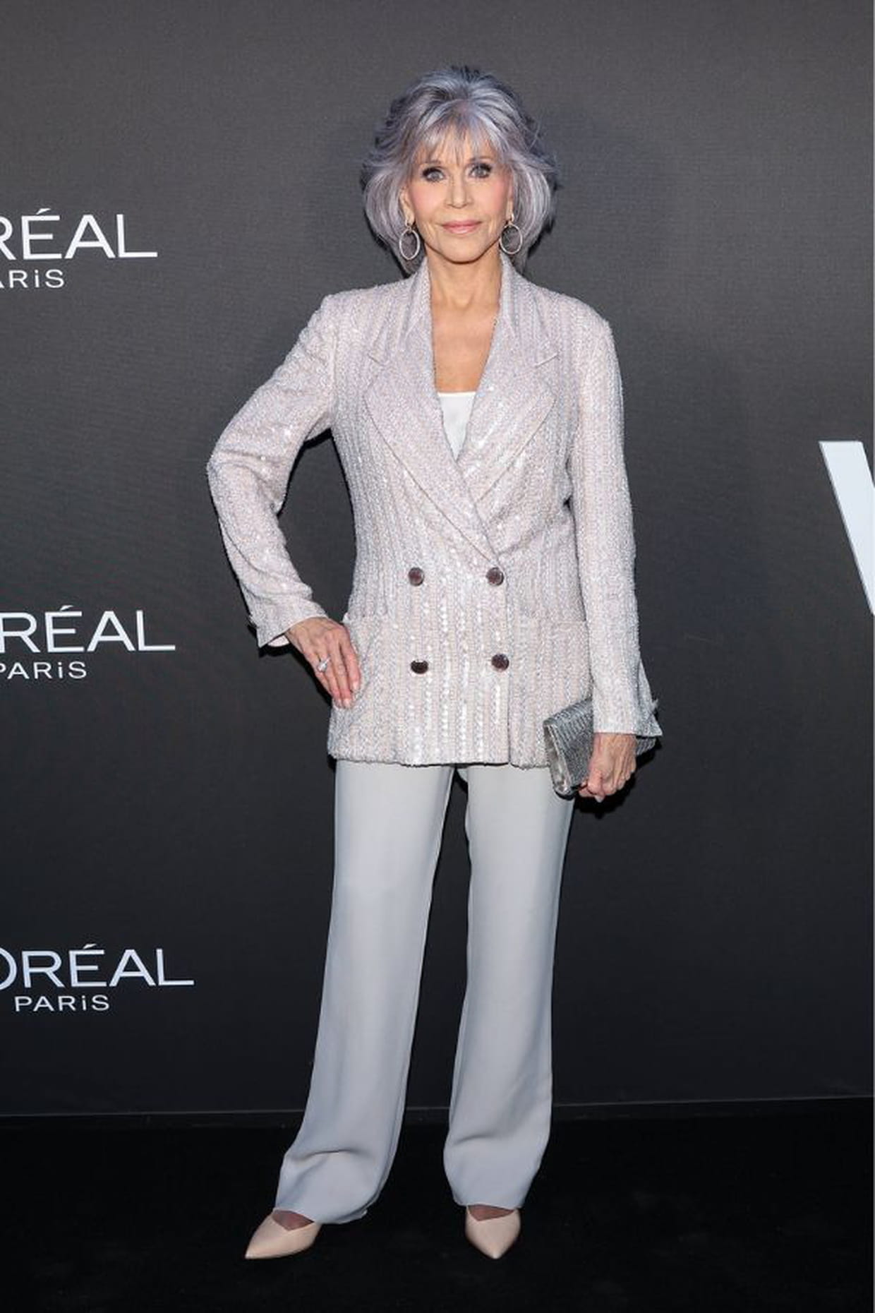 Jane Fonda en pantalon fluide et veste à sequins aux Lights on Women Awards organisés en marge de la 76ème édition du Festival de Cannes à Antibes le 26 mai 2023.