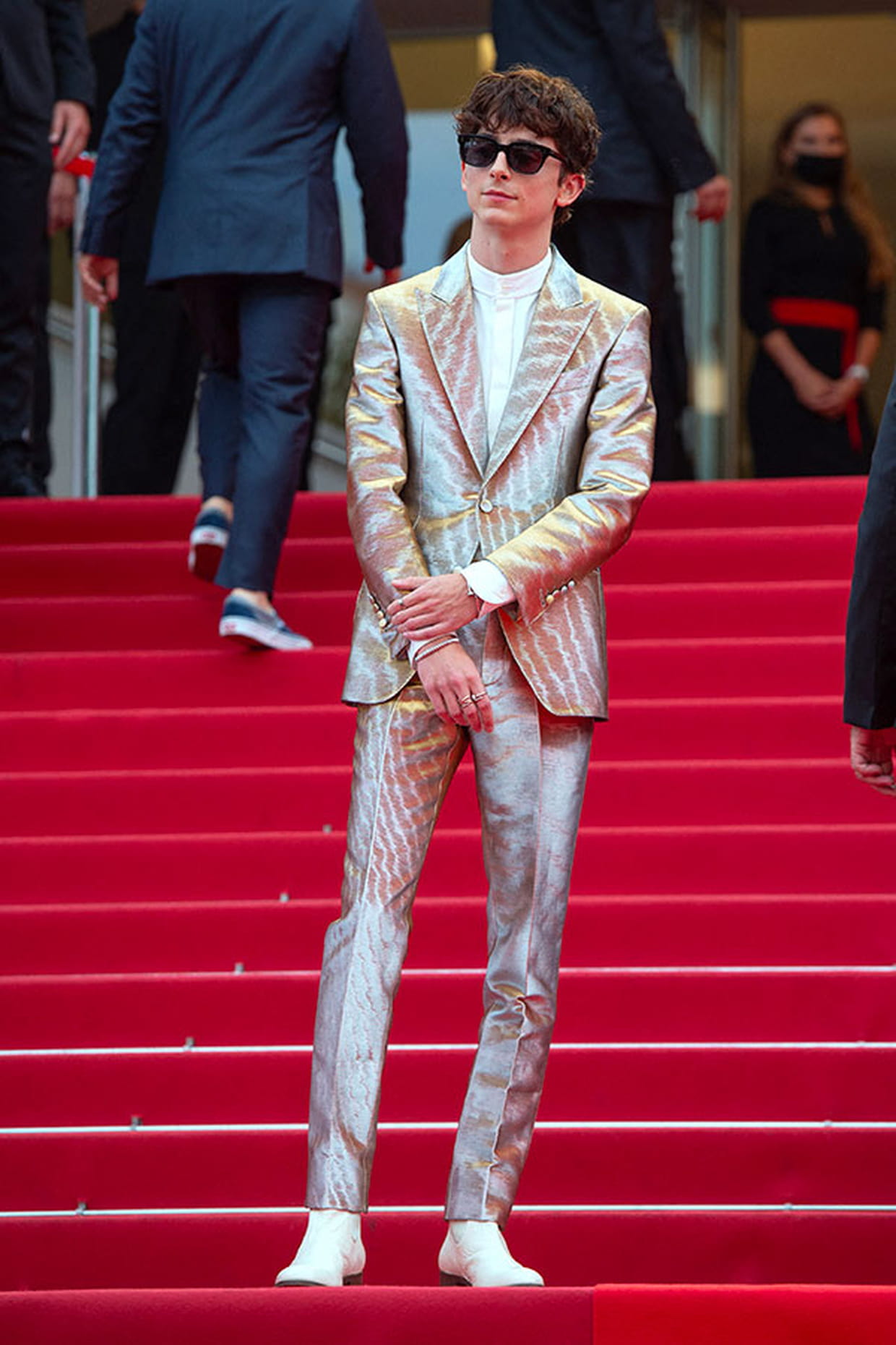 Timothée Chalamet en costume argenté brillant Tom Ford à l'avant-première du film The French Dispatch lors de la 74ème édition du Festival de Cannes le 11 juillet 2021.