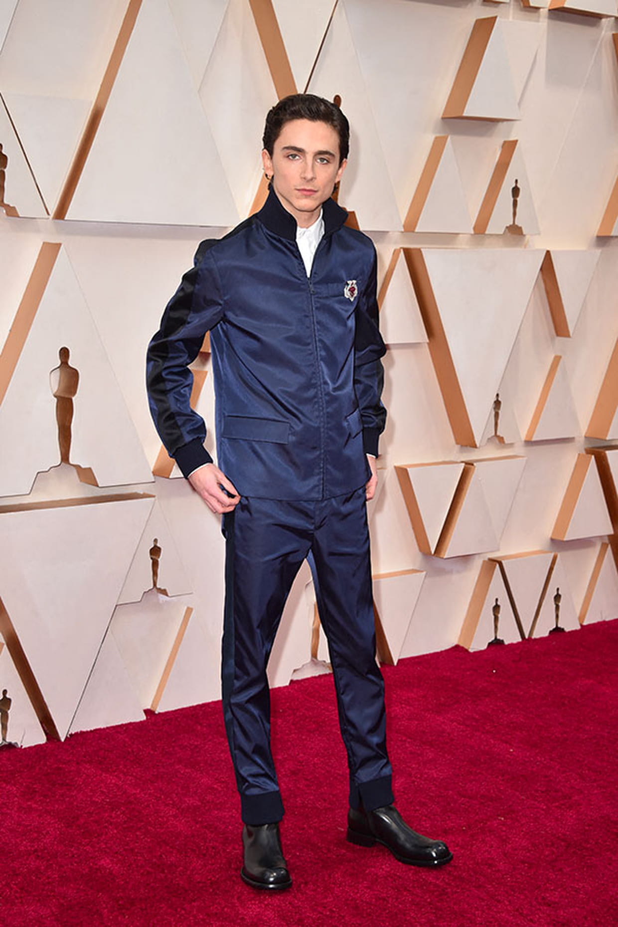 Timothée Chalamet en ensemble sportif satiné Prada à la 92ème édition des Oscars à Los Angeles le 9 février 2020.