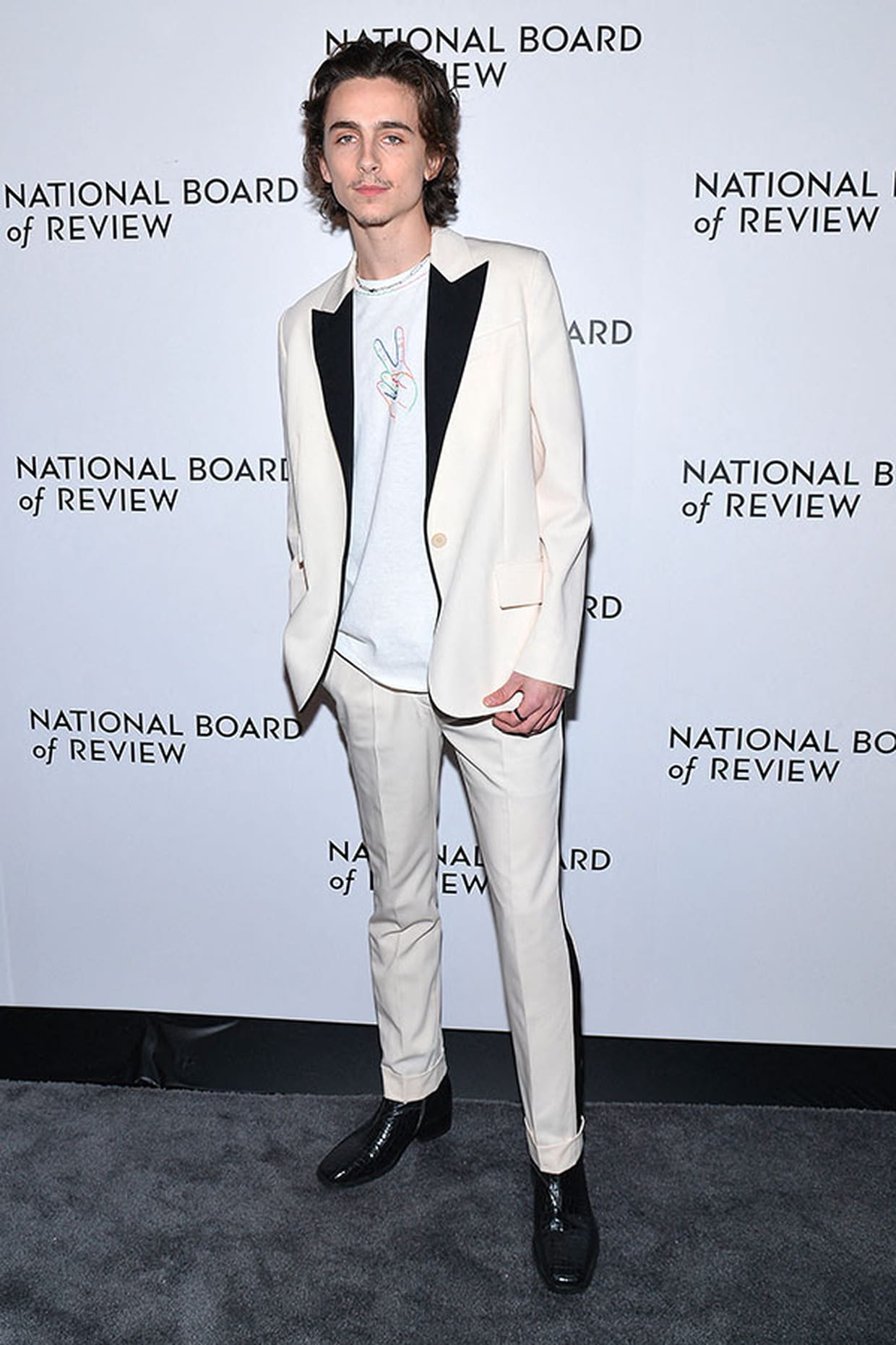 Timothée Chalamet en costume blanc Stella McCartney et T-shirt aux National Board of Review Annual Awards Gala à New York le 8 janvier 2020.