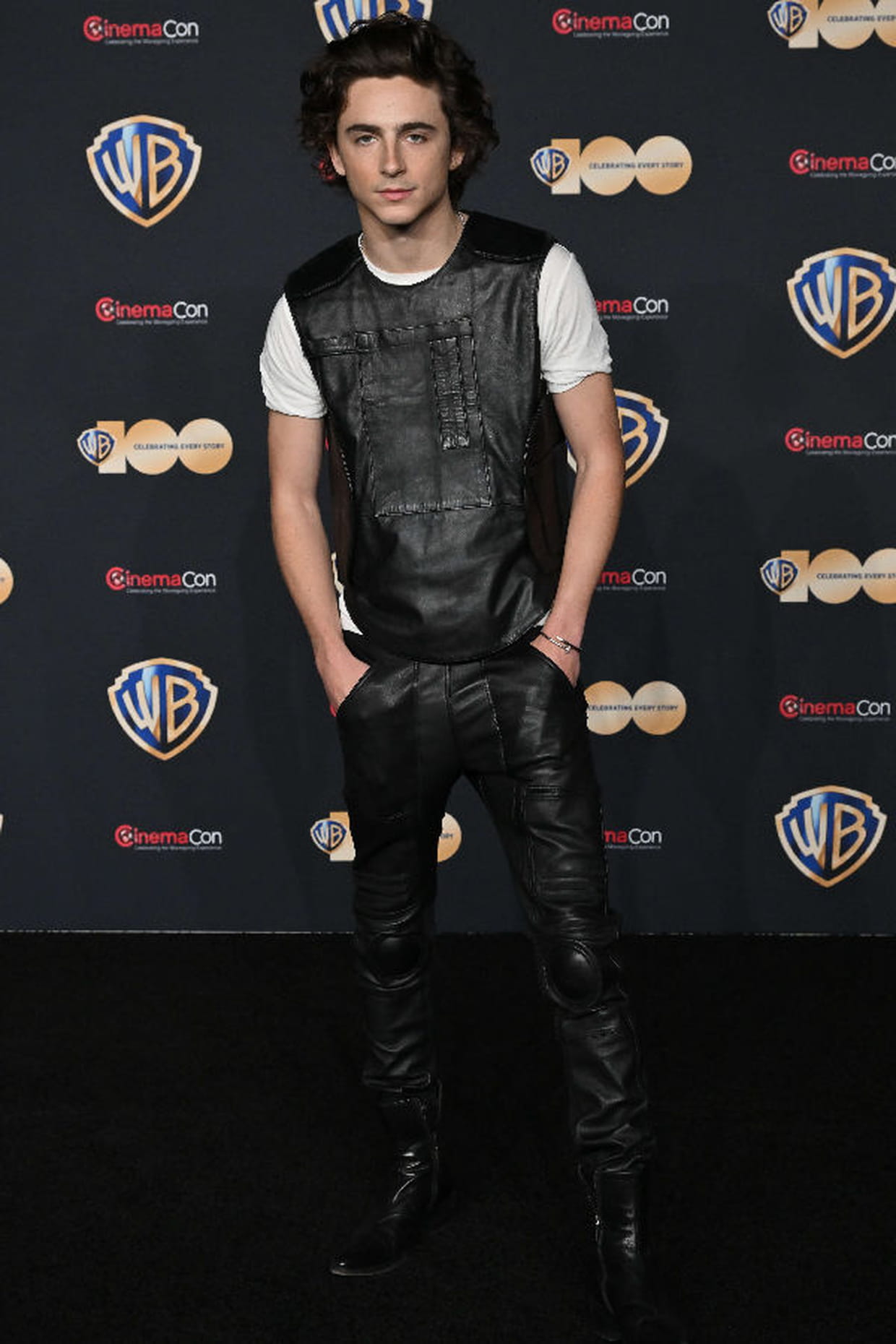 Timothée Chalamet en plastron et pantalon en cuir noir lors de la CinemaCon à Las Vegas le 25 avril 2023.