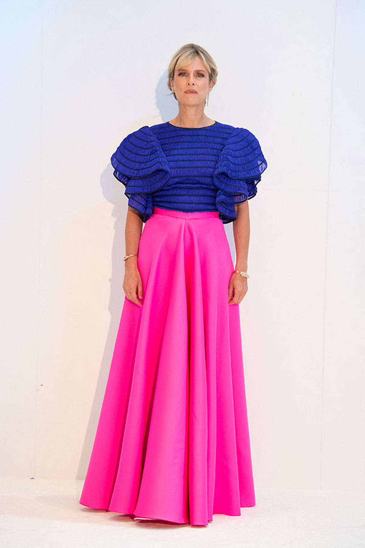 Karin Viard en blouse bleue et jupe rose bonbon à la 71ème édition au bal de la Croix-Rouge à Monaco le 26 juillet 2019.
