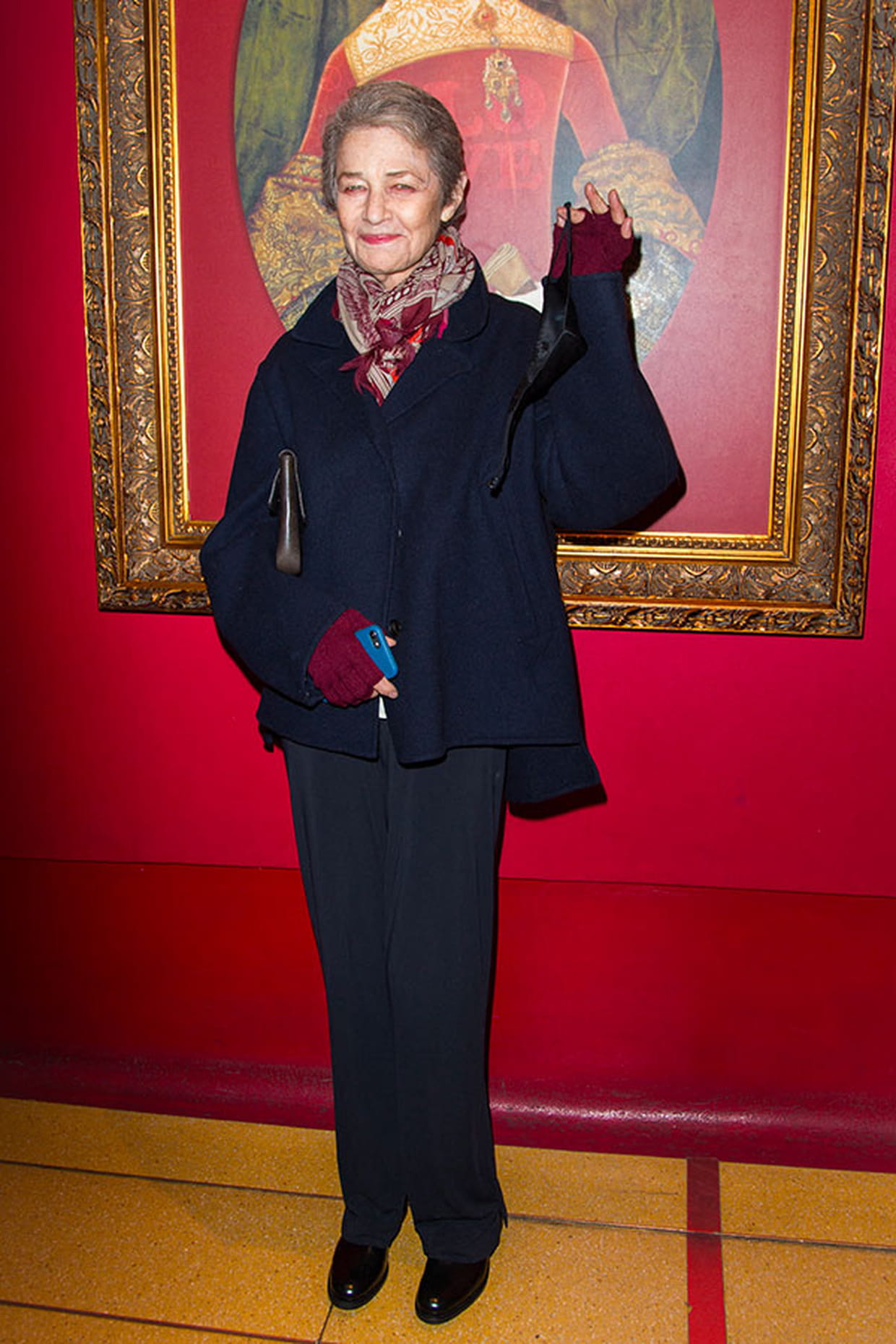 Charlotte Rampling en veste ample noire et foulard coloré