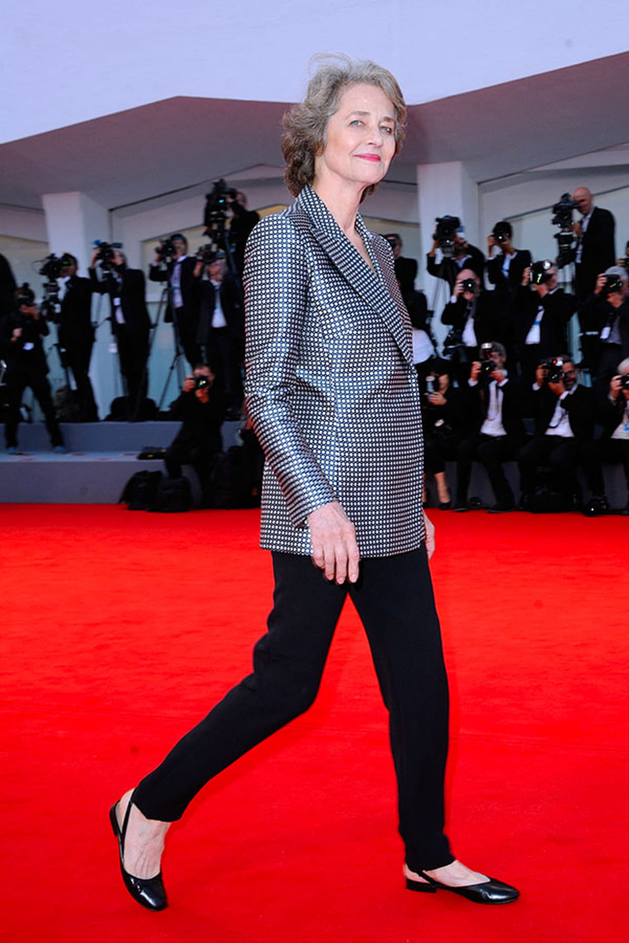 Charlotte Rampling en veste texturée grise et pantalon noir