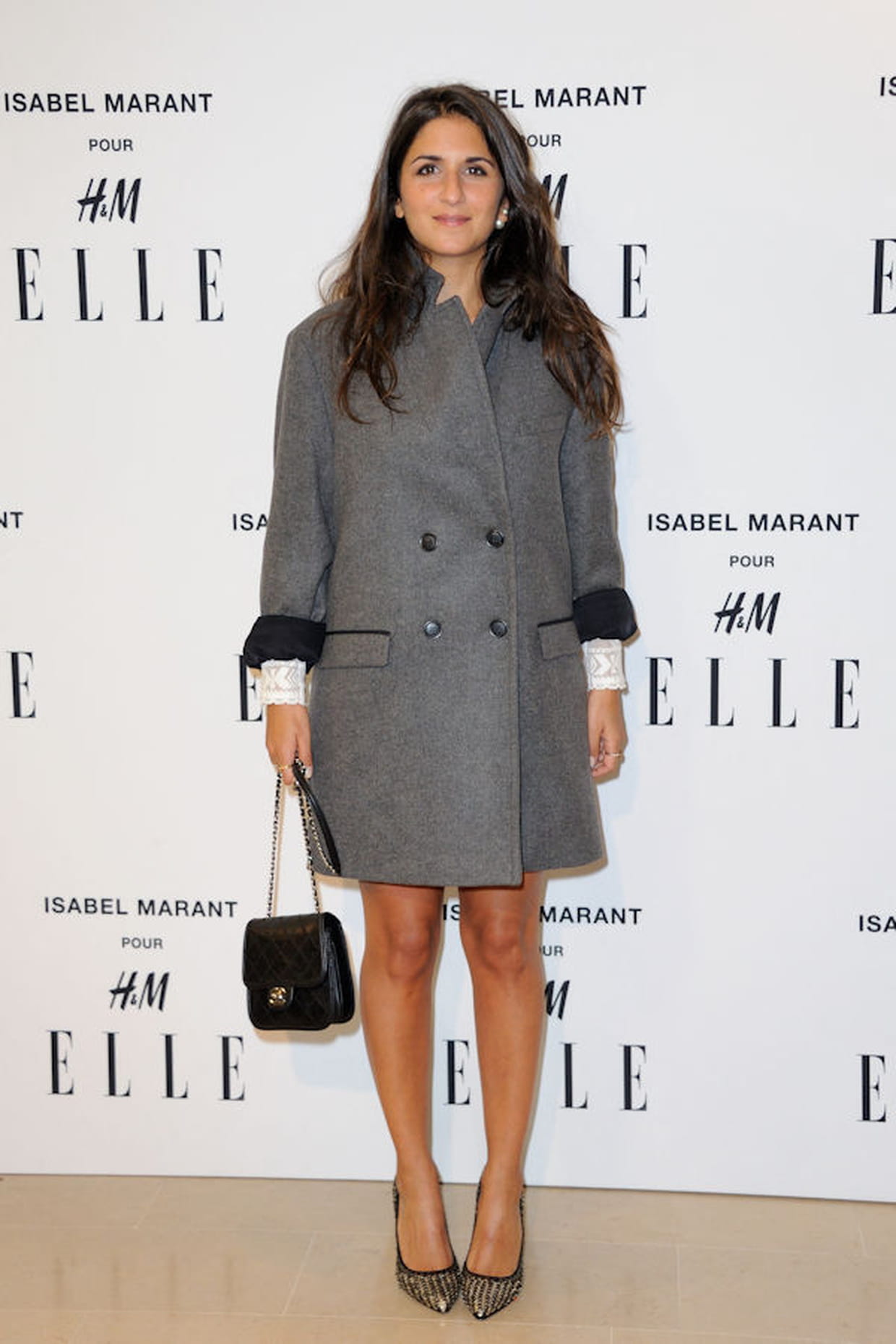 Géraldine Nakache en manteau gris fermé à double boutonnage et sac à main matelassé Chanel à la soirée Isabel Marant x H&M à Paris le 13 novembre 2013.