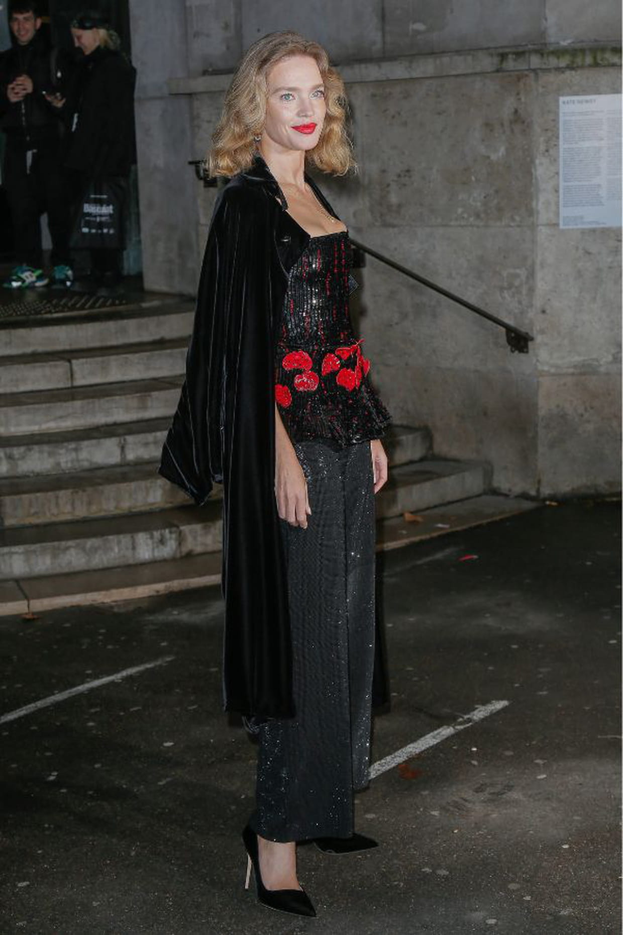 Natalia Vodianova en bustier fantaisie et manteau noir