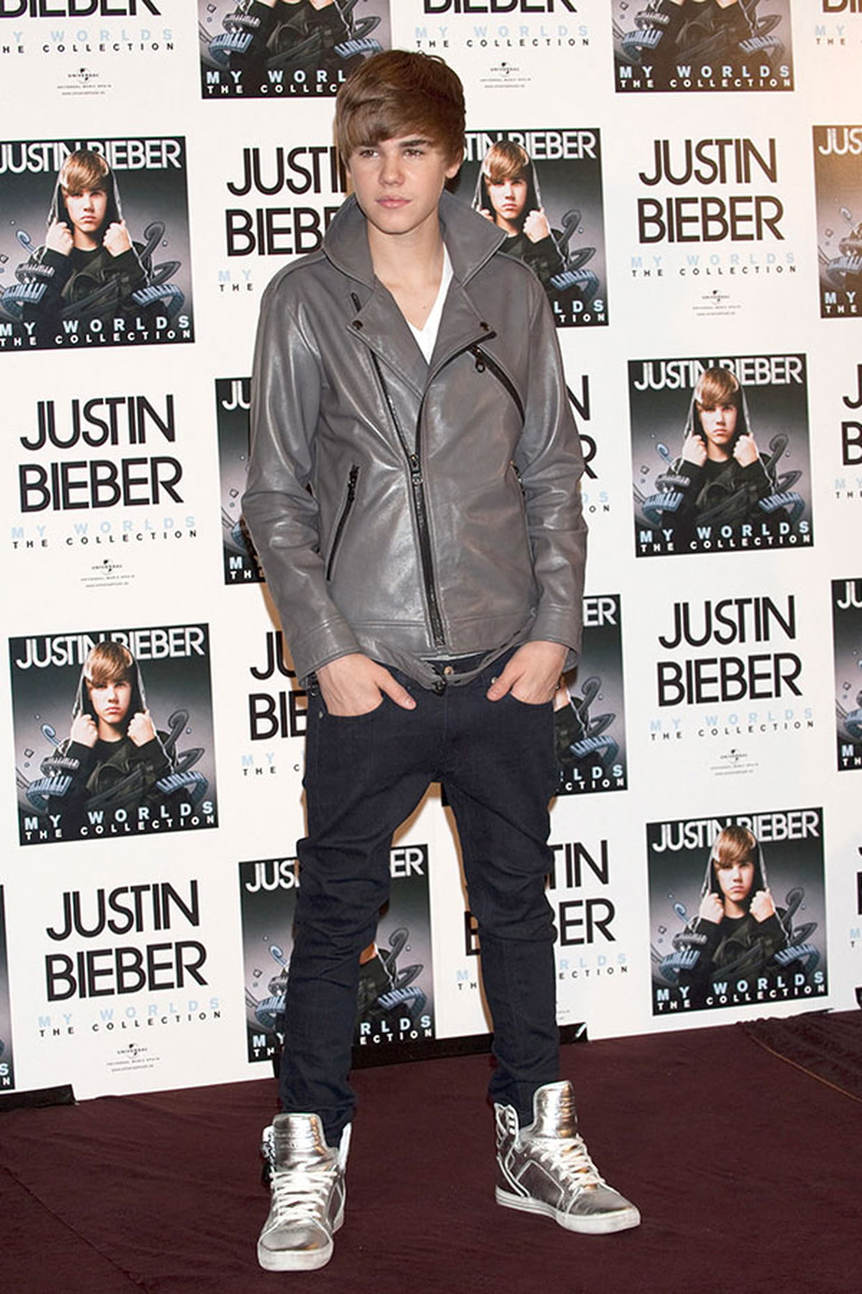 Justin Bieber en veste argentée et baskets assorties à une conférence de presse à Madrid le 27 novembre 2010.