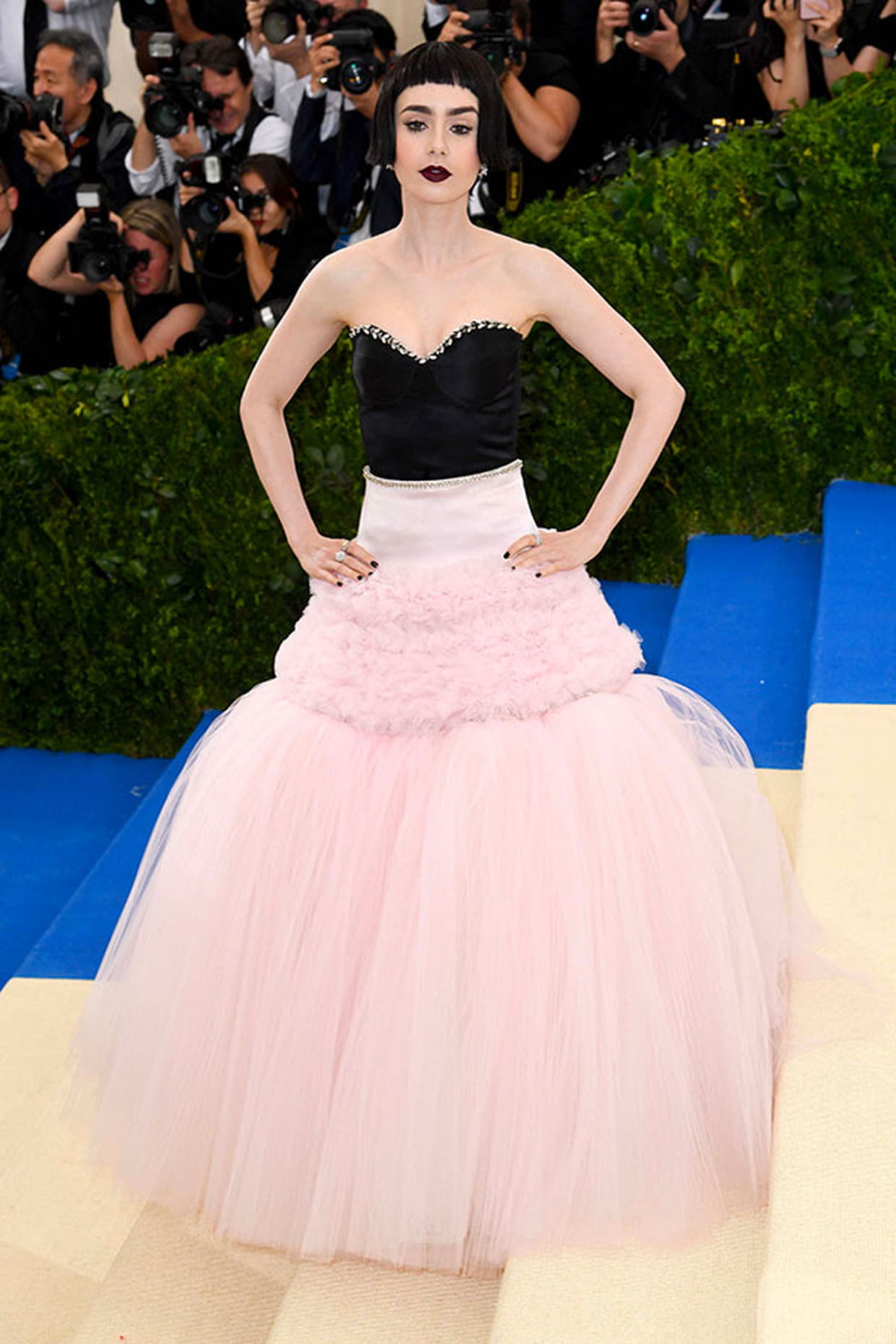 Lily Collins en robe bustier Giambattista Valli au Met Gala à New York le 1er mai 2017.