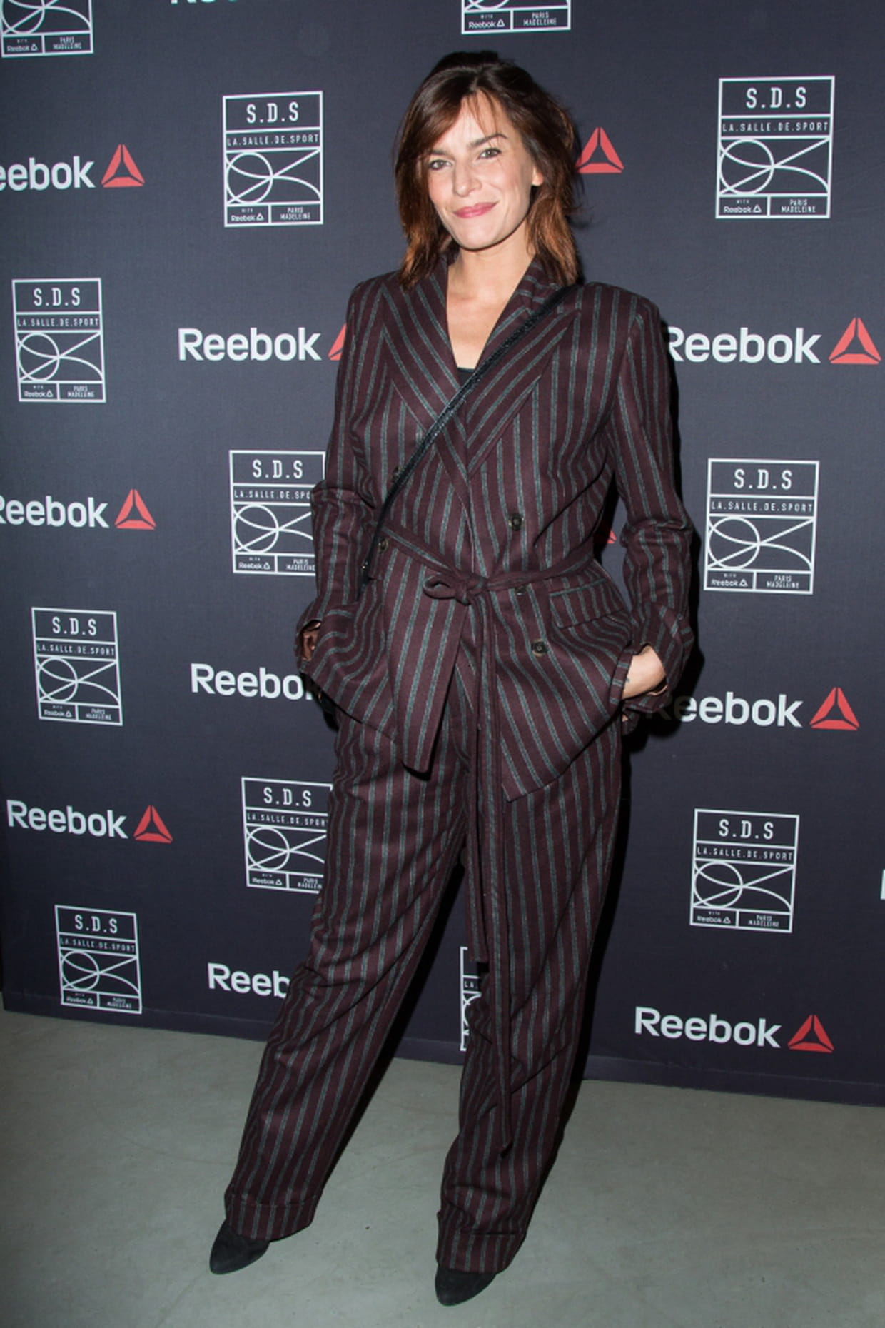 Fauve Hautot en ensemble à rayures lors du lancement d'une salle de sport Reebok à Paris le 16 novembre 2017.