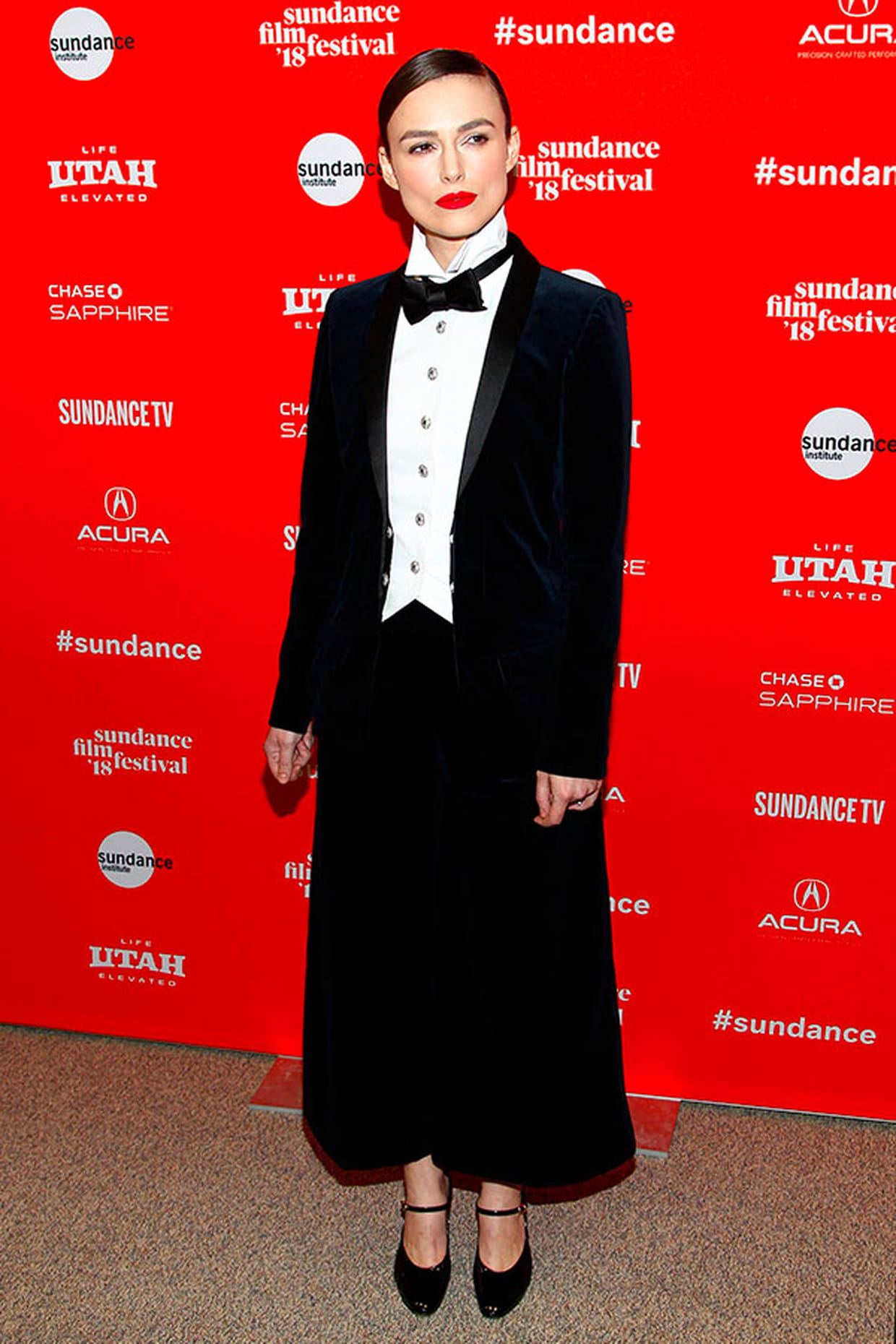 Keira Knightley en costume trois-pièces revisité à l'avant-première du film Colette à Park City le 20 janvier 2018.