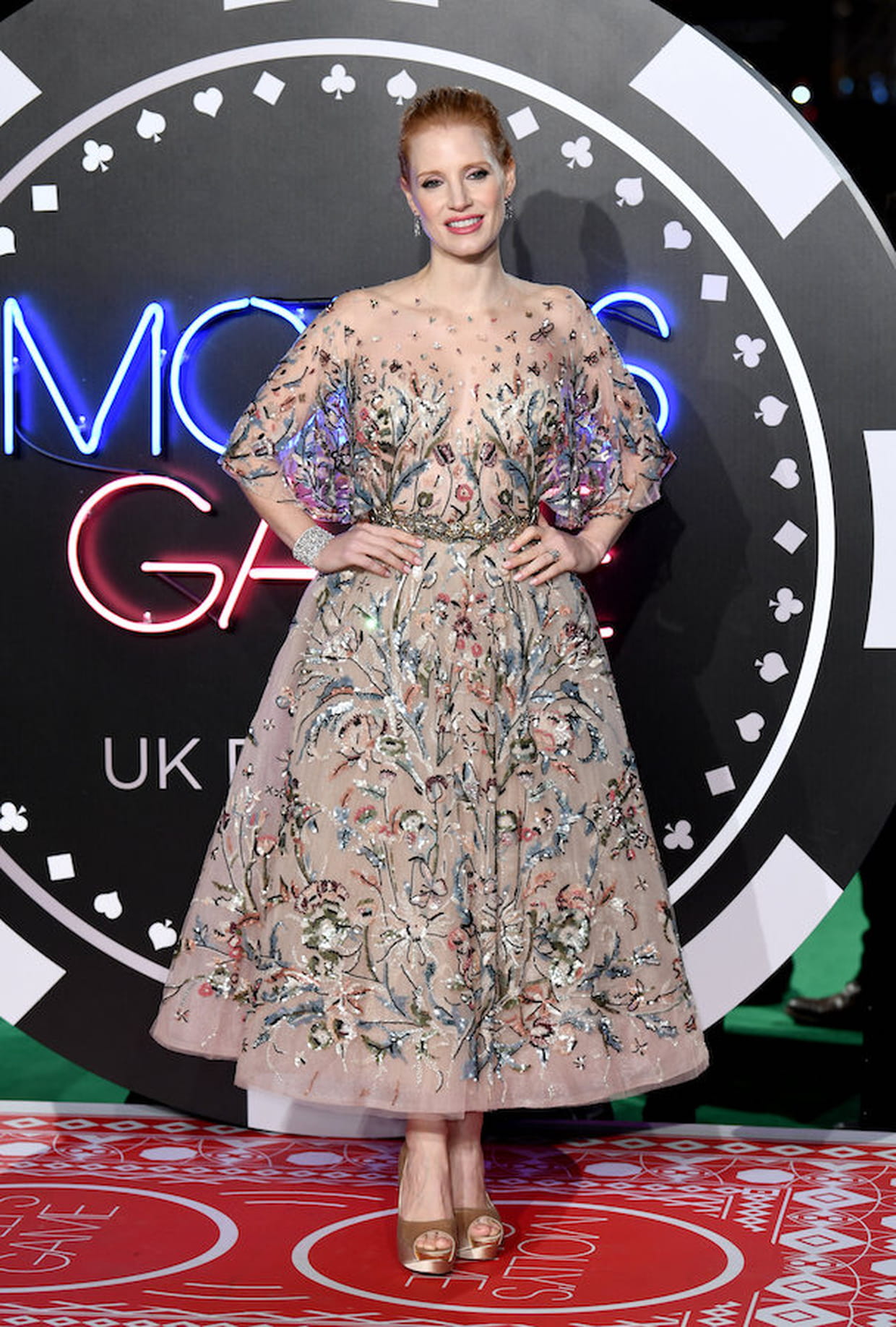 Jessica Chastain en robe en tulle fleurie lors de l'avant-première du film Le grand jeu à Londres le 7 décembre 2017.