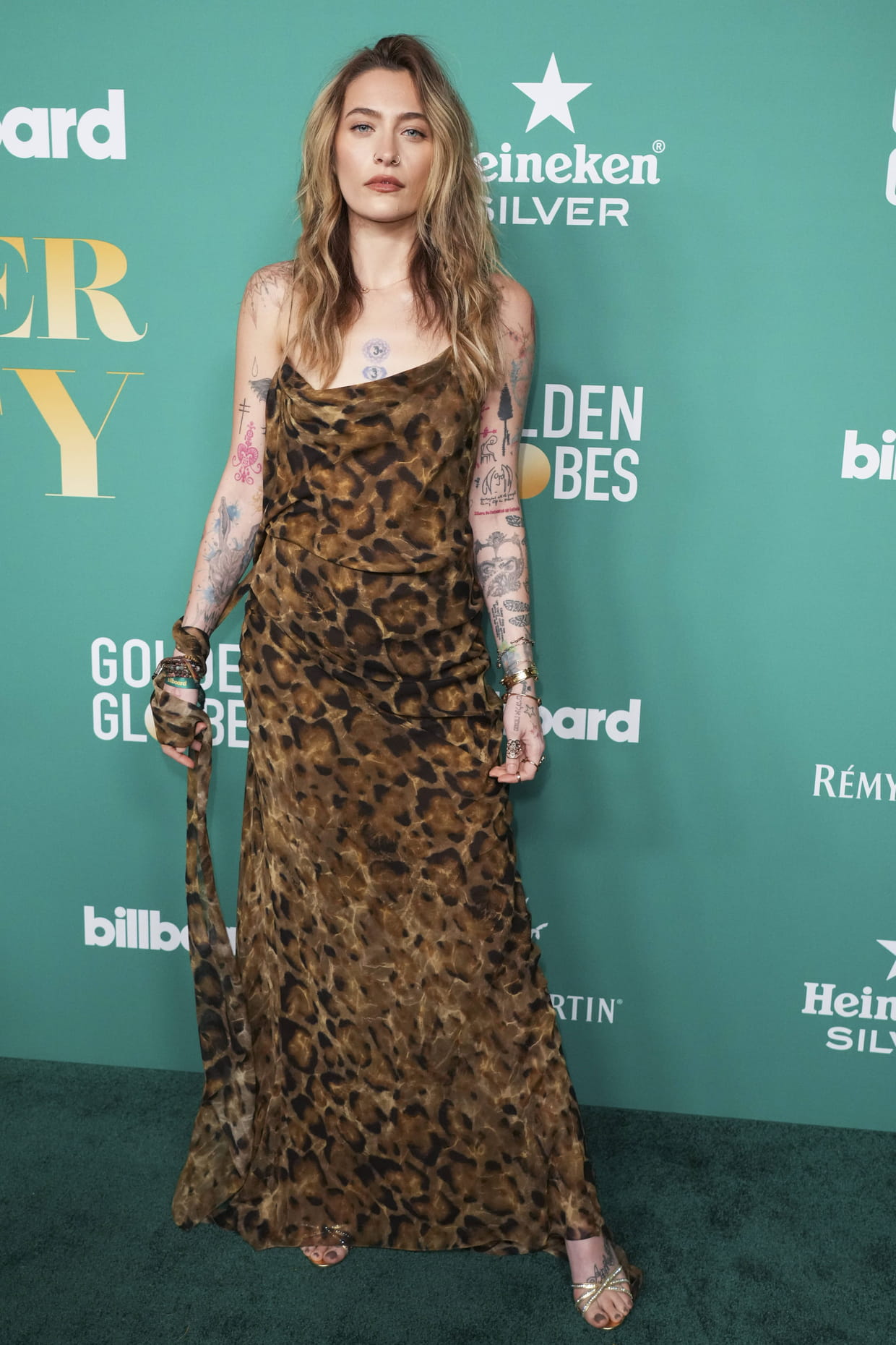 Paris Jackson en ensemble léopard lors de la 81ème édition des Globe Awards à Los Angeles le 7 janvier 2024.