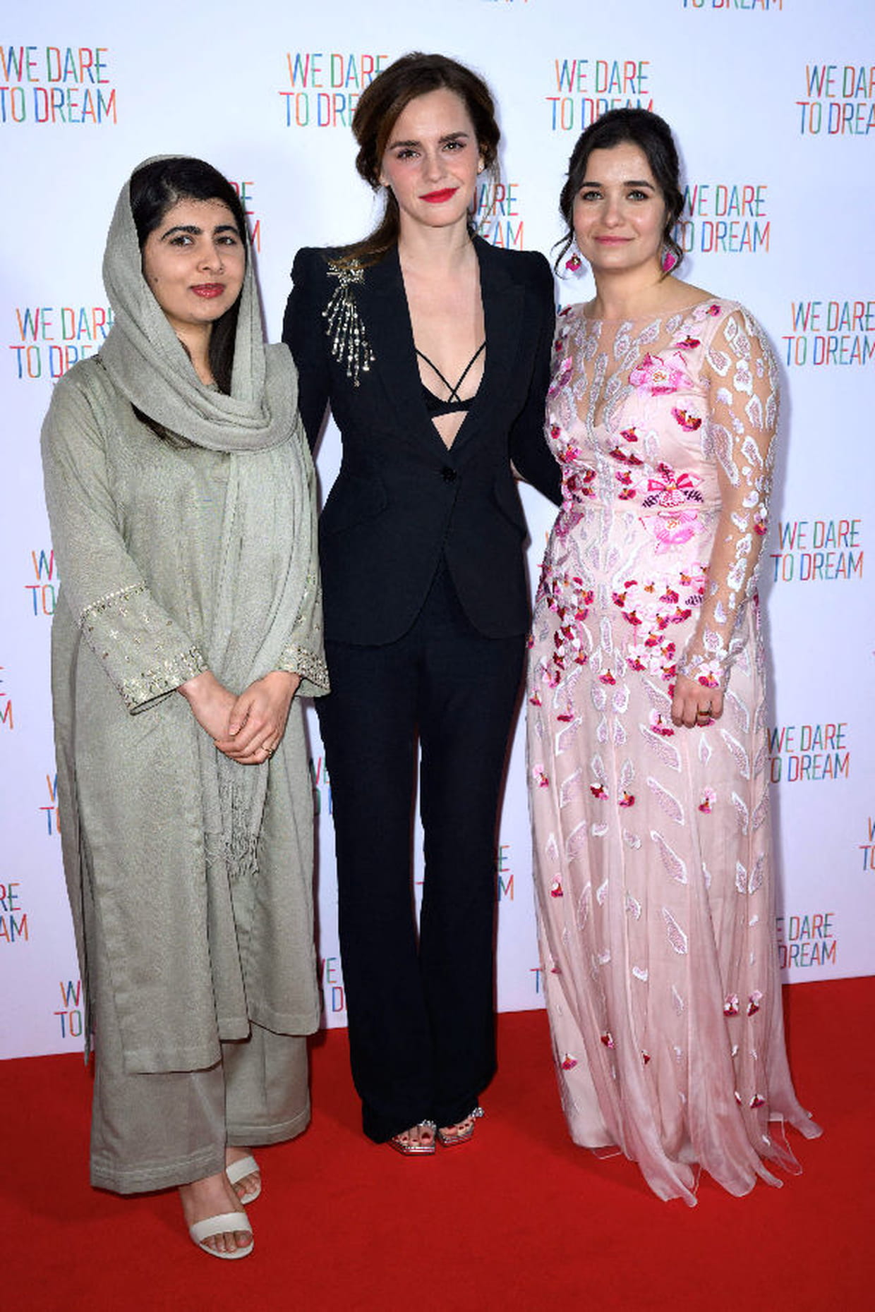 Emma Watson en smoking cintré noir et brassière graphique avec Malala et Waad Al-Kateab a l'avant-première de We Dare to Dream à Londres le 26 novembre 2023.