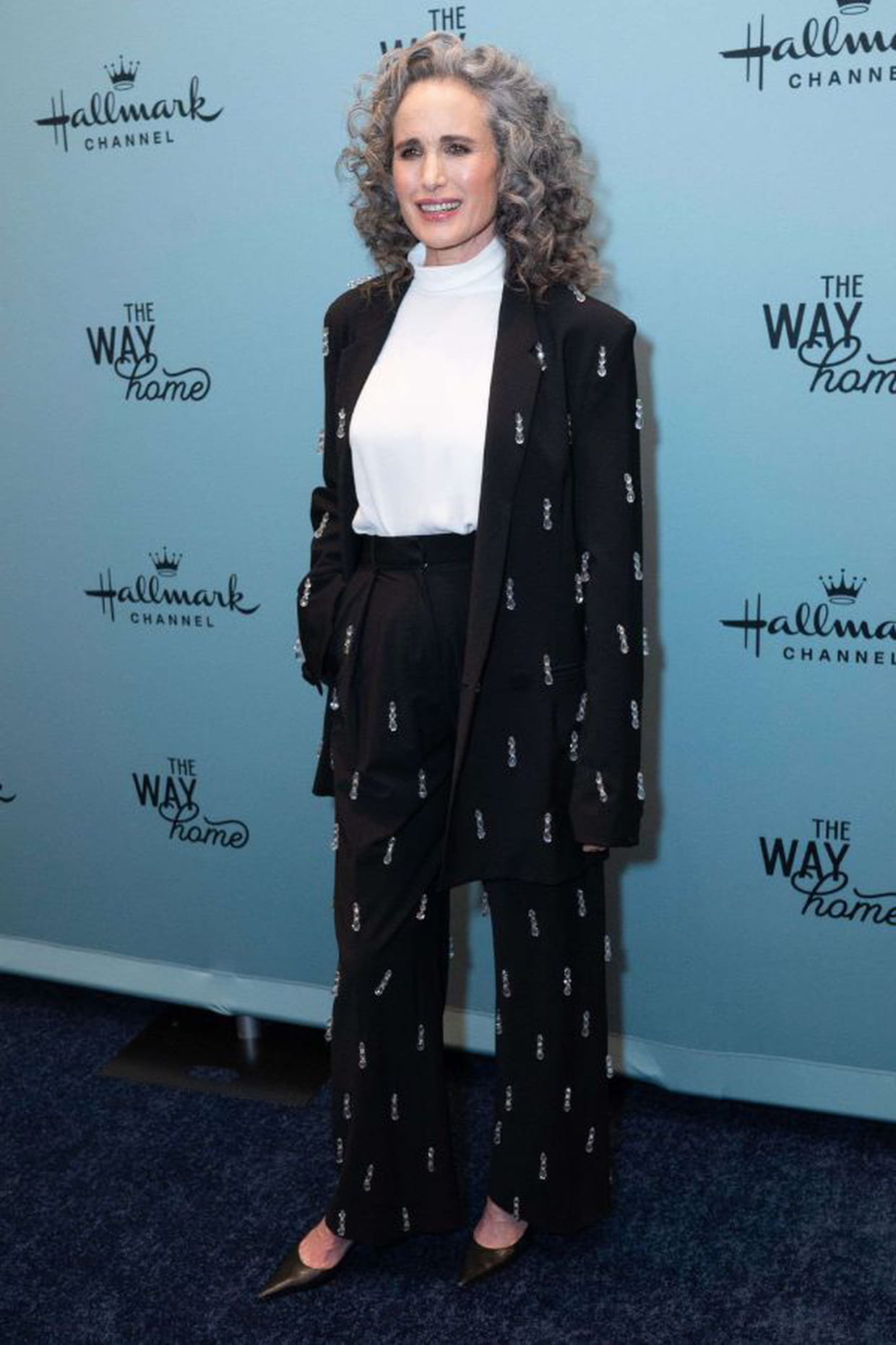 Andie MacDowell en costume noir subtilement brodé de strass à l'avant-première de la série The Way Home à New York 11 janvier 2023.