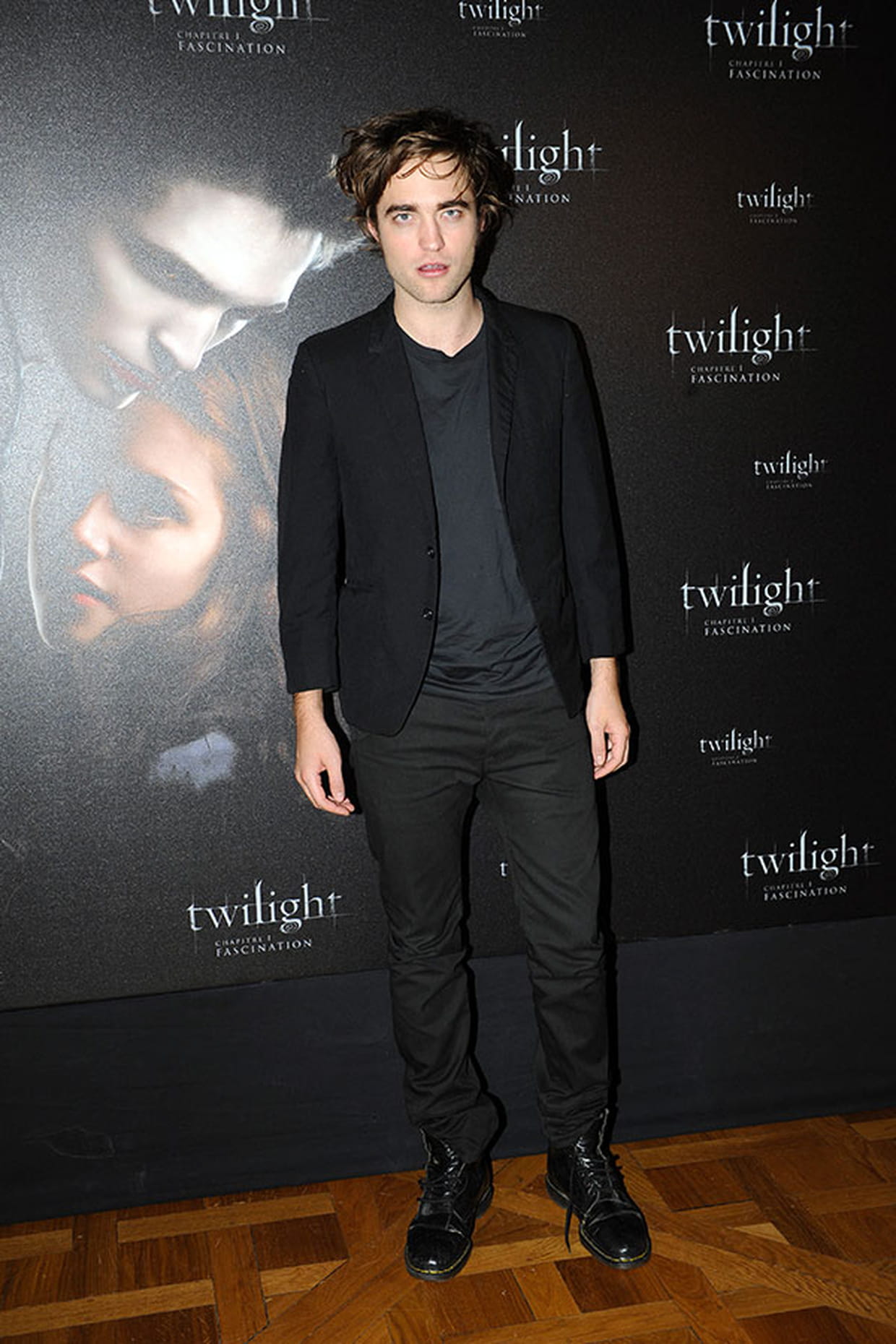 Robert Pattinson en costume noir et boots à lacets au photocall du film Twilight, chapitre I : fascination à Paris le 8 décembre 2008.