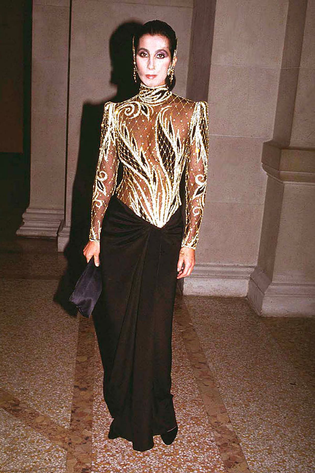 Cher en top brodé de strass dorés et jupe noire au Met Gala le 9 décembre 1985.