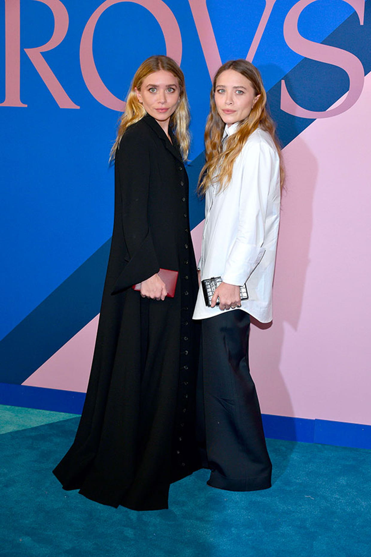 Ashley Olsen en long manteau noir, Mary-Kate en chemise blanche et pantalon satiné aux CFDA Fashion Awards à New York le 5 juin 2017.