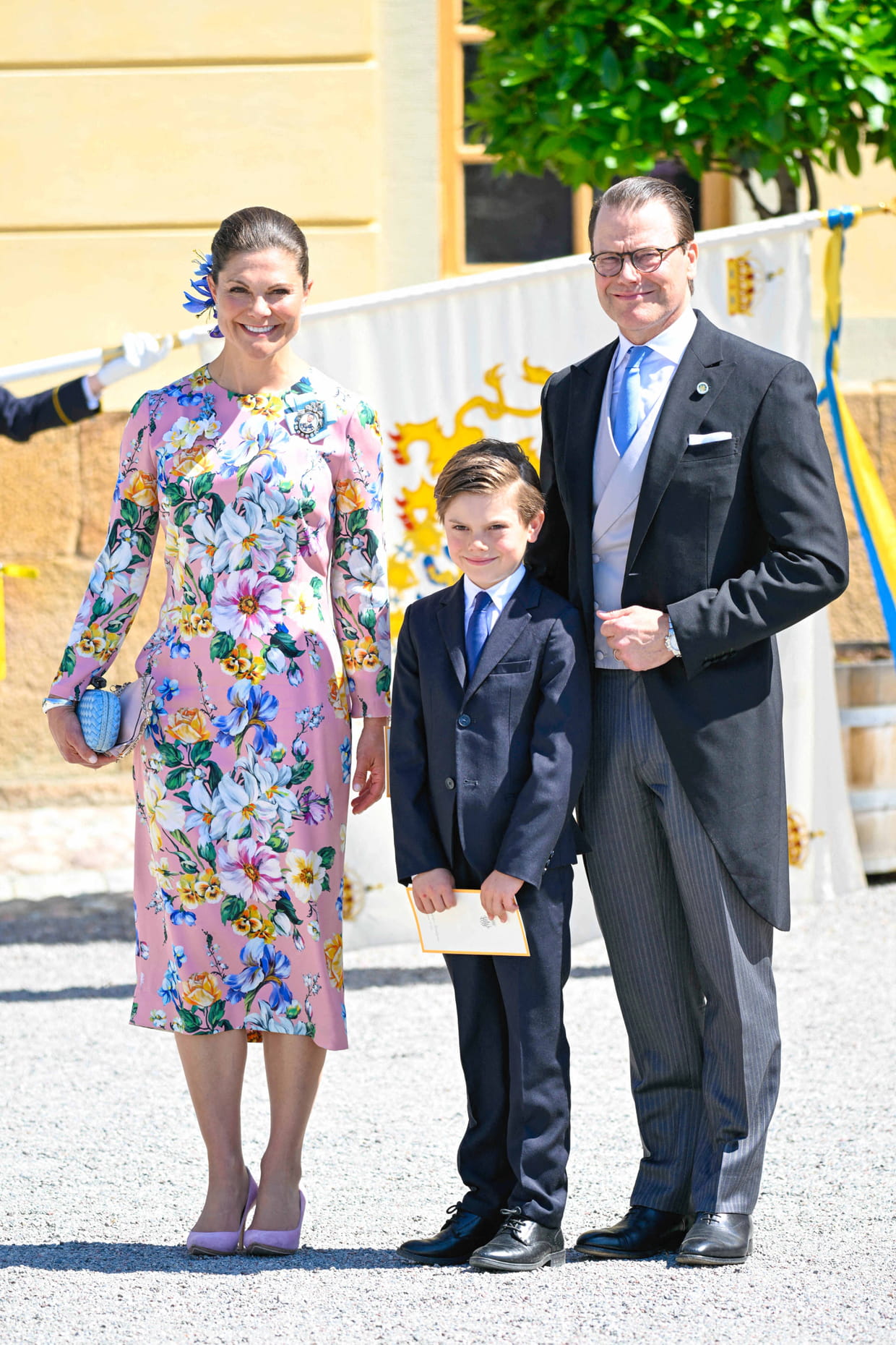 Victoria de Suède en robe rose à fleurs, très colorée, lors du baptême de la princesse Inès dans la chapelle du palais de Drottningholm à Stockholm, le 13 juin 2025.