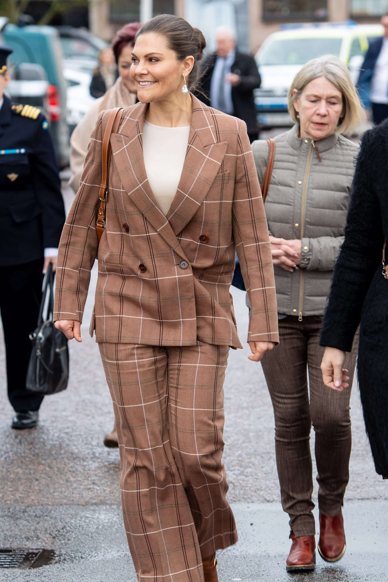 Victoria de Suède en tailleur chic à carreaux lors d'une visite officielle à Skane Sweden le 29 janvier 2020.