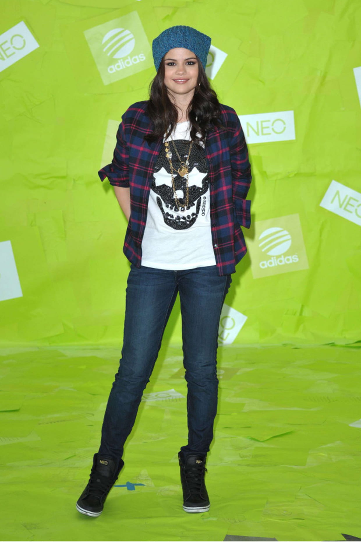 Selena Gomez en chemise à carreaux et jean lors d'un événement Adidas à Los Angeles le 20 novembre 2012.